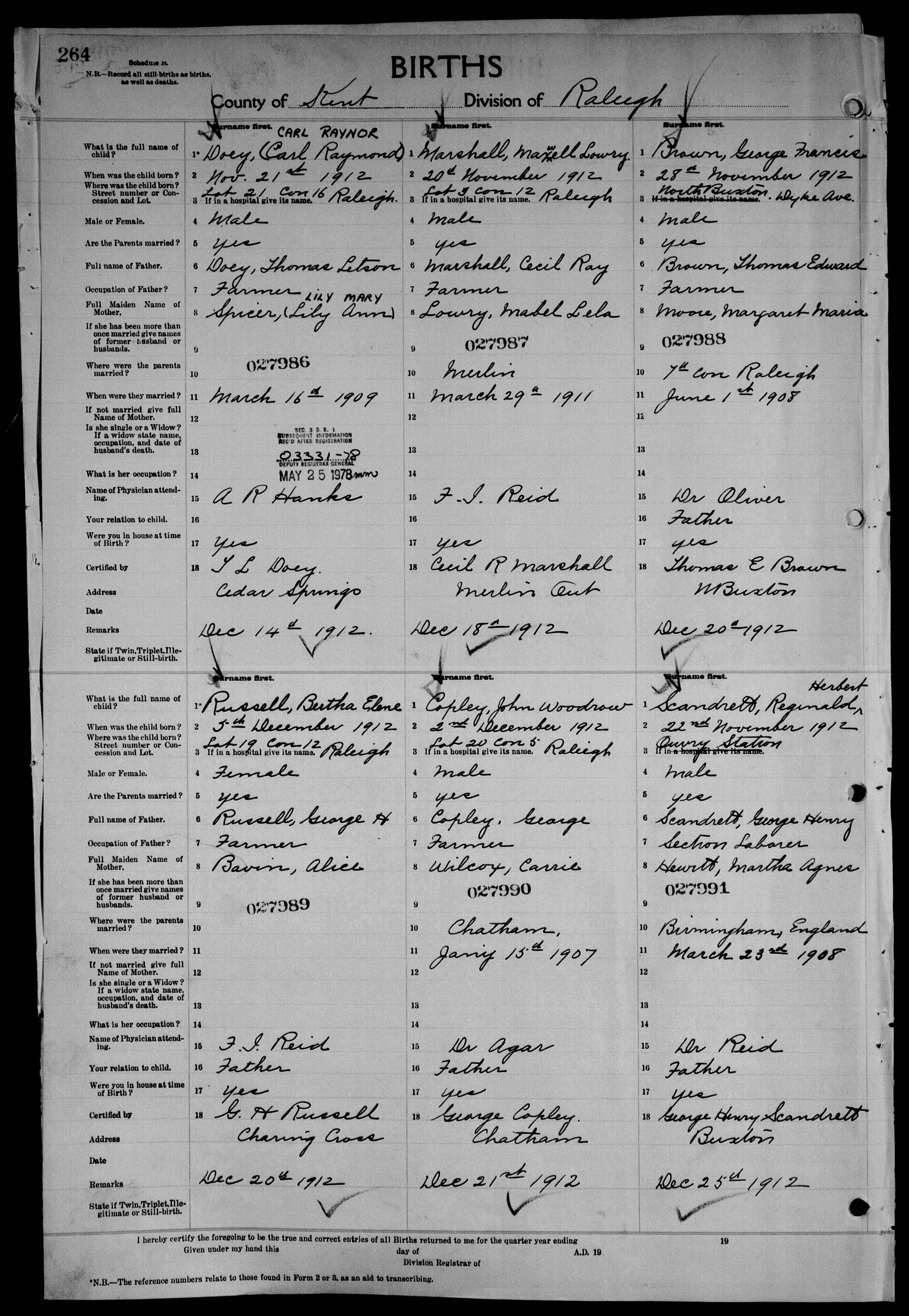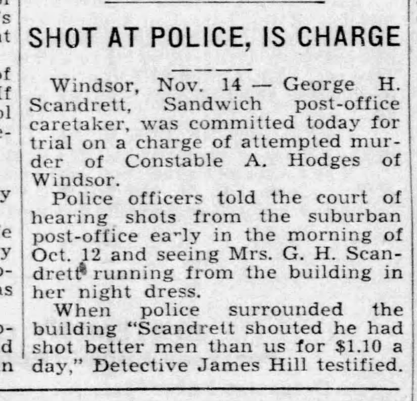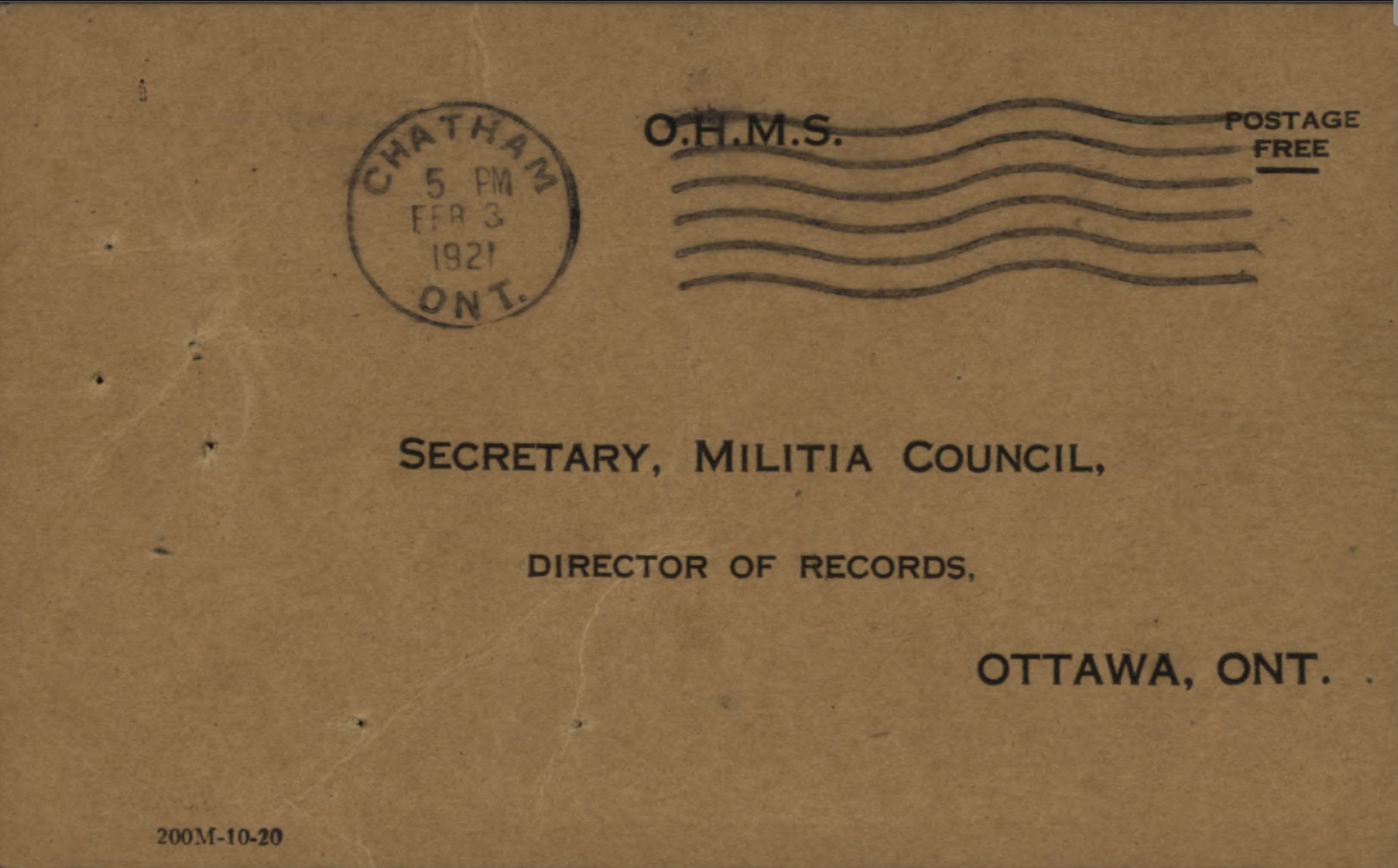 Family Search: Private George Henry Scandrett was born on 20 December 1886, in Vauxhall, London, England, United Kingdom. He married Martha Agnes Hewitt on 23 March 1908, in Birmingham, Warwickshire, England, United Kingdom. They were the parents of at least 3 sons. He immigrated to Quebec City, Quebec, Canada in 1911 and lived in Chatham, Kent, Ontario, Canada for about 5 years. He registered for military service in 1916. In 1916, at the age of 30, his occupation is listed as labourer in Chatham, Kent, Ontario, Canada. He died on 5 June 1963, in Windsor, Essex, Ontario, Canada, at the age of 76, and was buried in Victoria Memorial Gardens, Oldcastle, Essex, Ontario, Canada.