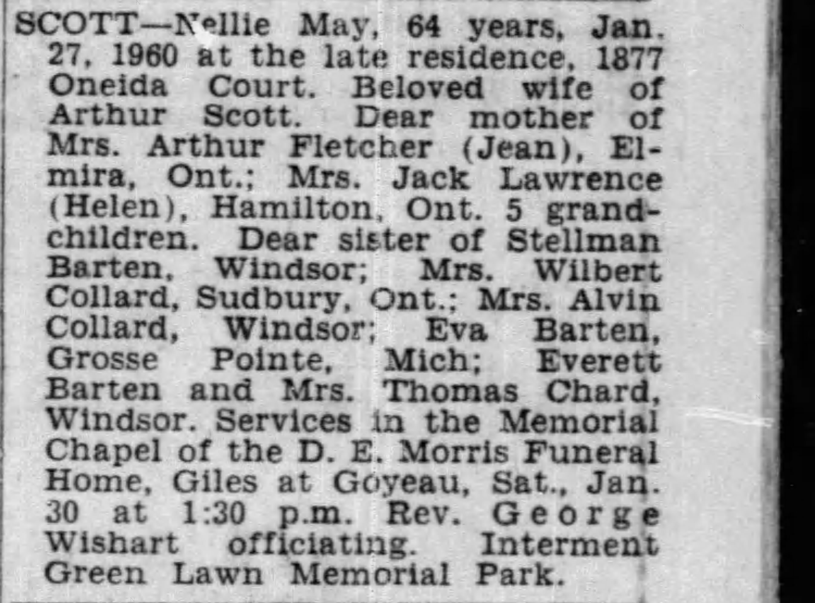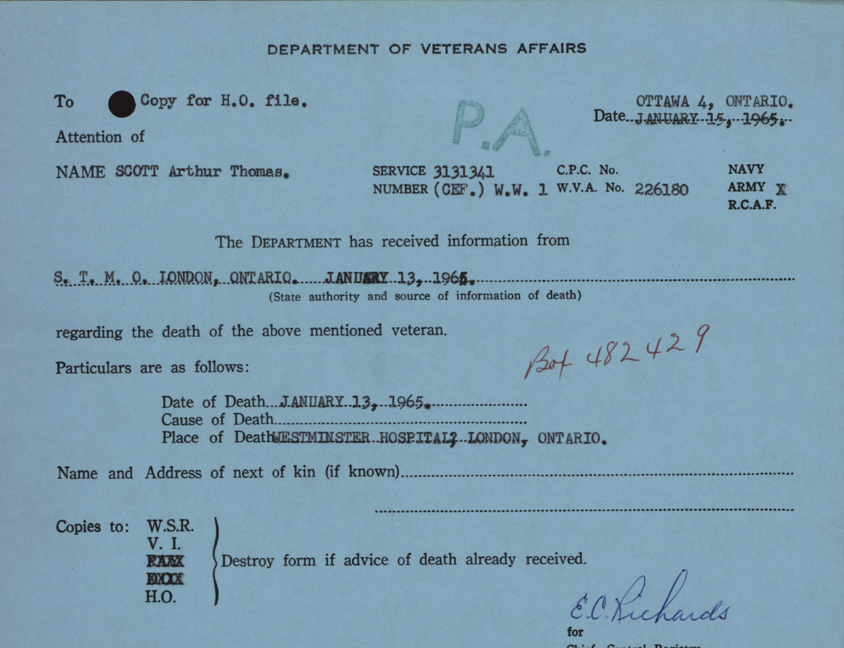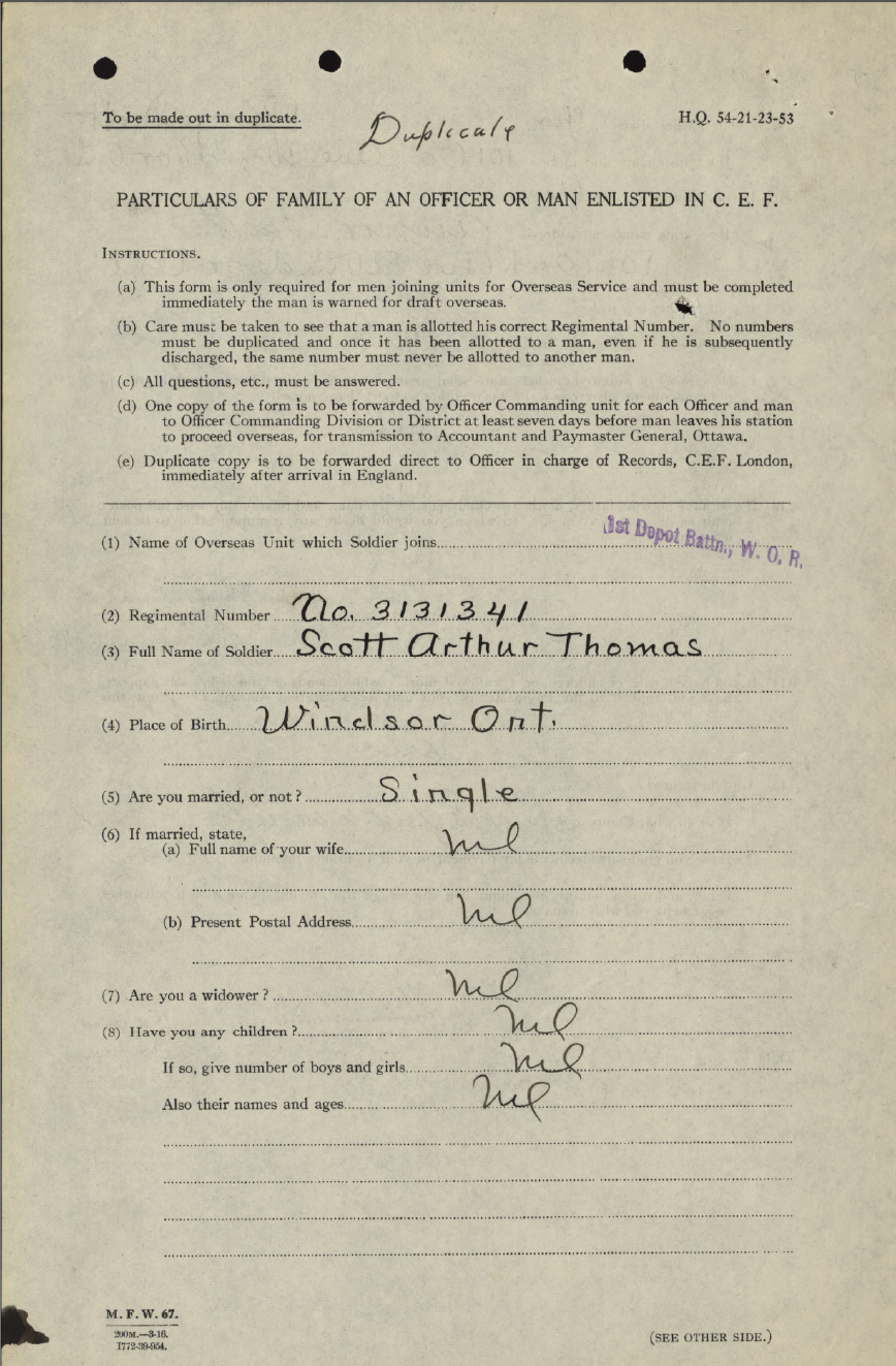 Family Search: When Private Arthur Thomas Scott was born on 22 November 1892, in Windsor, Sandwich, Essex, Ontario, Canada, his father, George S. Scott, was 34 and his mother, Mary Ann Vesey, was 31. He married Nellie May Barton on 17 November 1923, in Windsor, Sandwich, Essex, Ontario, Canada. They were the parents of at least 1 son and 1 daughter. He lived in Essex, Ontario, Canada for about 10 years. He registered for military service in 1918. In 1918, at the age of 26, his occupation is listed as machinist in Windsor, Sandwich, Essex, Ontario, Canada. He died on 13 January 1965, in London, Ontario, Canada, at the age of 72, and was buried in Greenlawn Memorial Gardens, Oldcastle, Essex, Ontario, Canada.