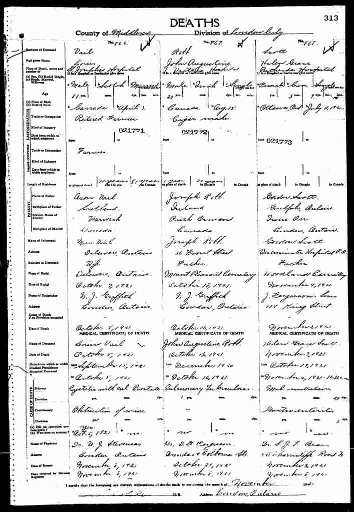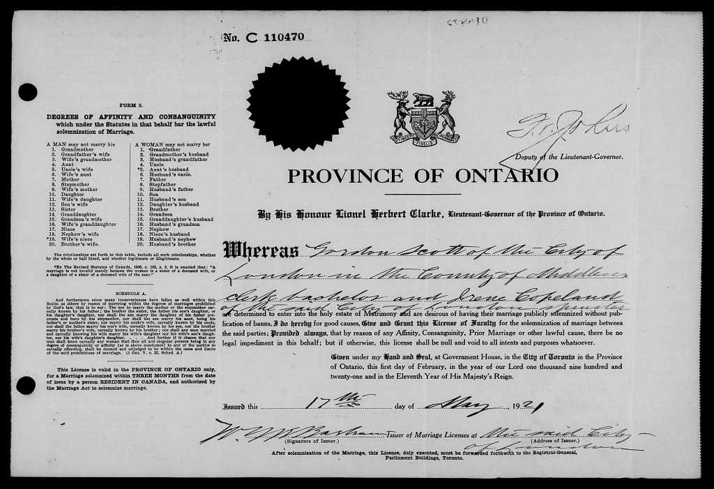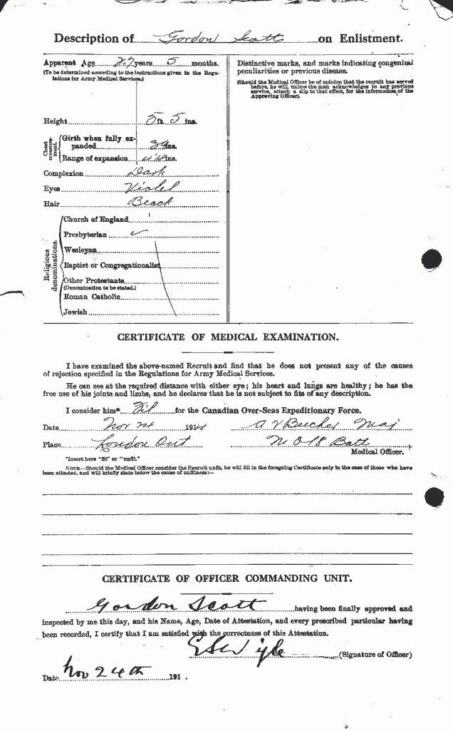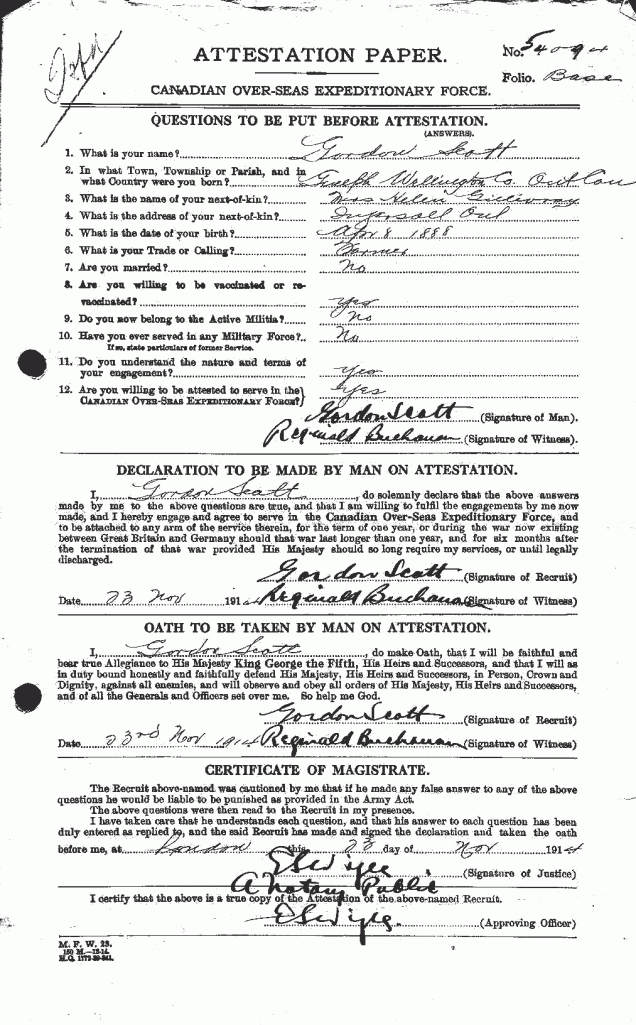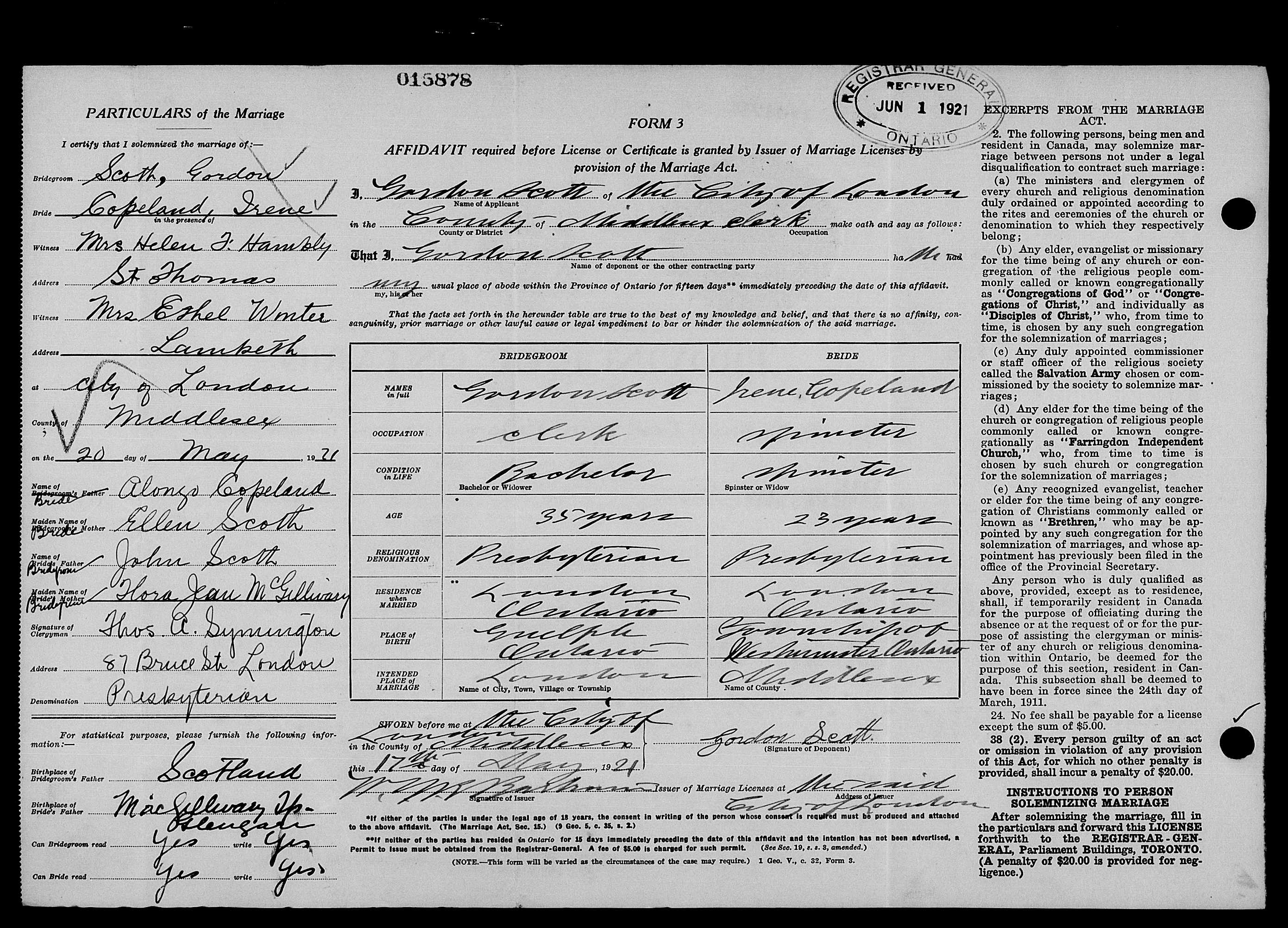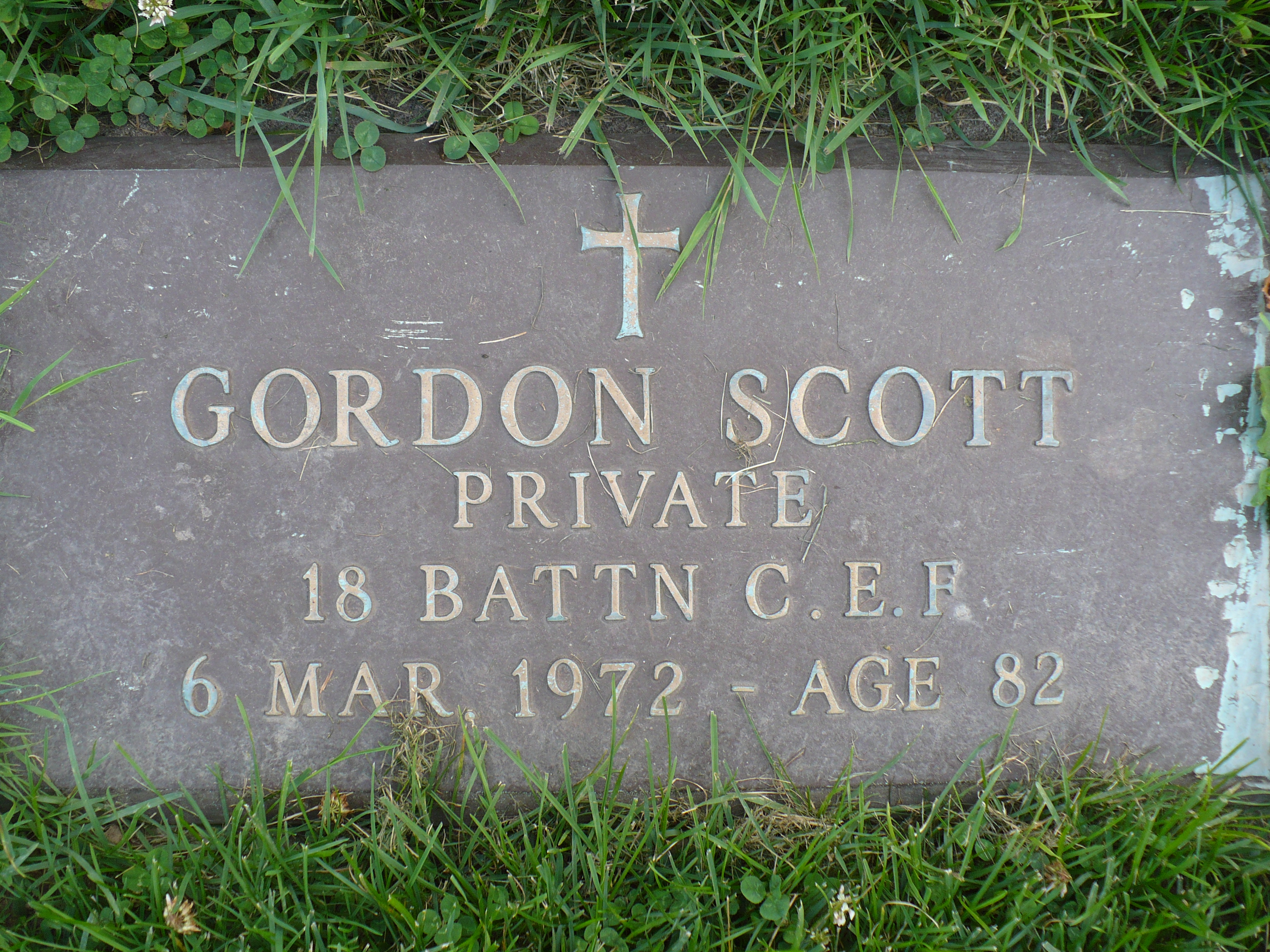 Family Search: When Gordon Scott was born on 8 April 1889, in Guelph, Wellington, Ontario, Canada, his father, John Scott, was 44 and his mother, Flora Jane McGilvray, was 34. He married Irene Orr Copeland on 17 May 1921, in Ontario, Canada. They were the parents of at least 1 daughter. He lived in Lambeth, London, Ontario, Canada in 1920 and London, Ontario, Canada in 1921. He registered for military service in 1914. In 1914, at the age of 25, his occupation is listed as farmer. He died on 6 March 1972, at the age of 82, and was buried in Forest Lawn Memorial Gardens, London, Ontario, Canada.