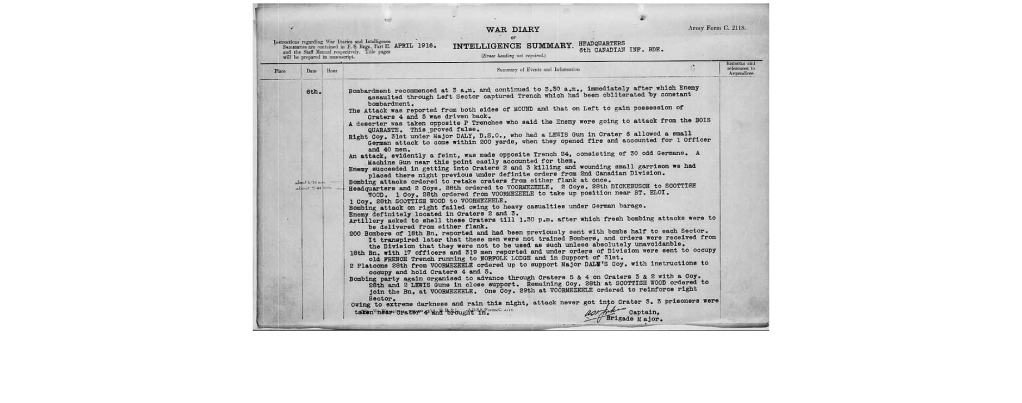 This, it looks like Pte. Searle may have actually participated in the action at St. Elois Craters on 6 April. The 6th Canadian Infantry Brigade War Diary relates, in part,