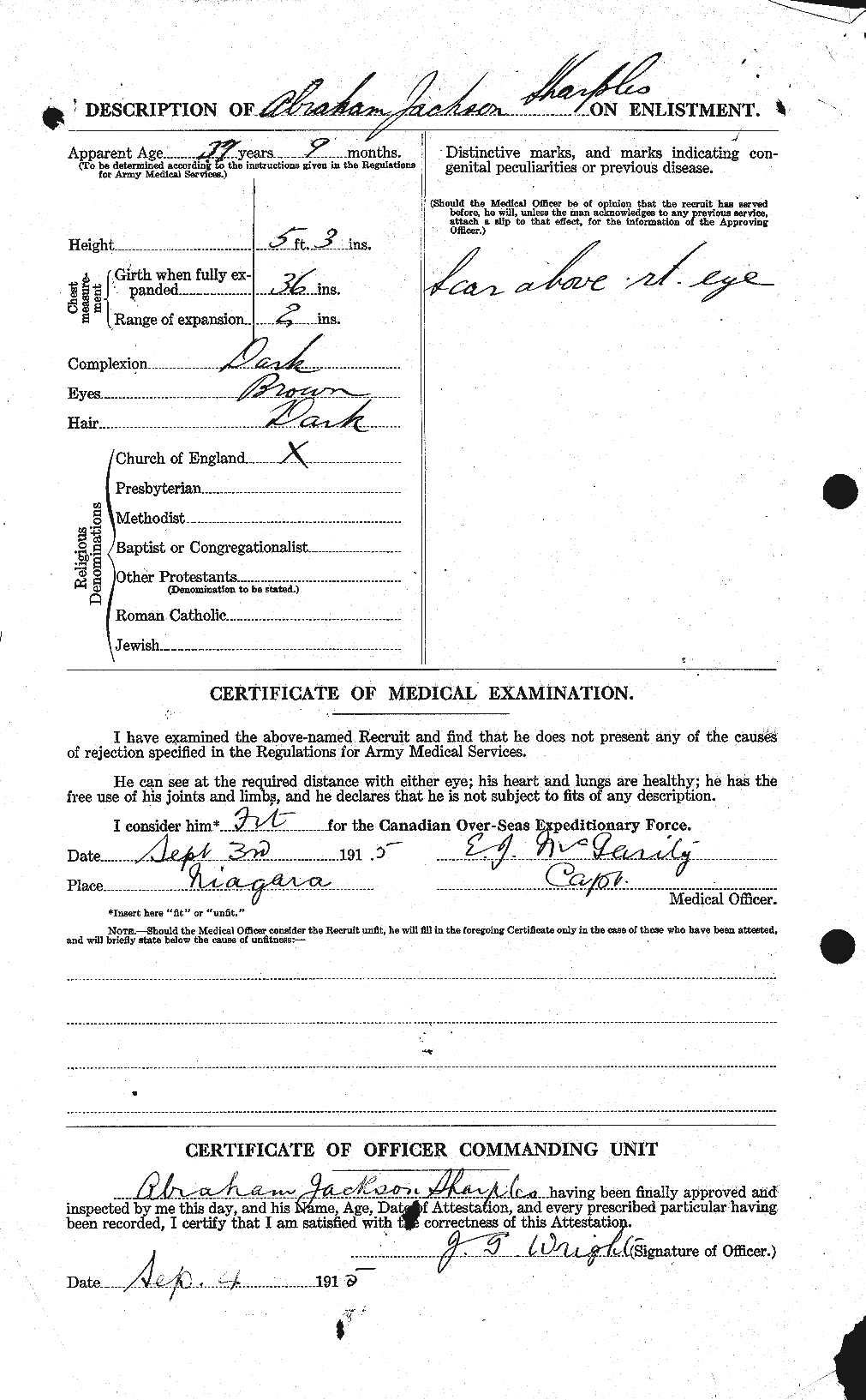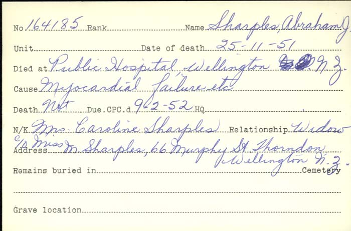 Family Search: When Private Abraham Jackson Sharples was born on 9 November 1877, in Lancaster, Lancashire, England, United Kingdom, his father, Thomas Sharples, was 27 and his mother, Mary Sharples, was 27. He lived in Brantford, Brant, Ontario, Canada, in 1916 and Gisborne, Gisborne, New Zealand in 1929. He registered for military service in 1915. In 1916, at the age of 39, his occupation is listed as labourer in Brantford, Brant, Ontario, Canada. He died on 25 November 1951, in Wellington, New Zealand, at the age of 74, and was buried in Taruheru Cemetery, Makauri, Gisborne, New Zealand.