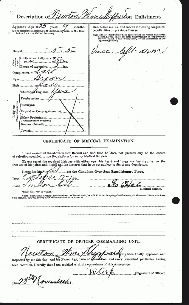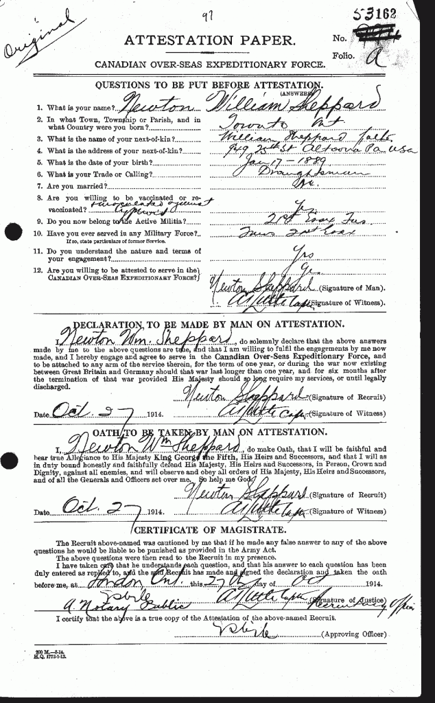 Family Search: When Newton William Sheppard was born on 17 January 1889, in Toronto, York, Ontario, Canada, his father, William Sheppard, was 34 and his mother, Christina Taylor, was 36. He had at least 1 daughter with Katherine Adelaide Lingenfelter. He lived in East Orange, Essex, New Jersey, United States in 1930 and Jacksonville Beach, Duval, Florida, United States in 1940. He registered for military service in 1914. In 1914, at the age of 25, his occupation is listed as draughtsman. He died in December 1969, in Tallahassee, Leon, Florida, United States, at the age of 80