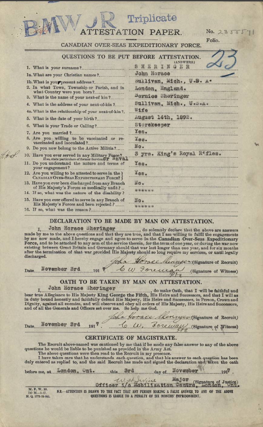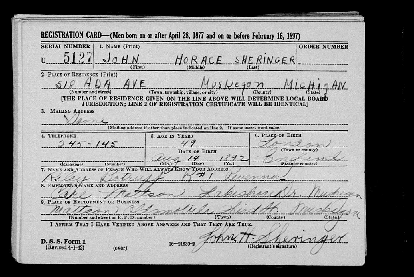 Family Search: Private John Horace Sheringer was born on 14 August 1892, in London, England as the son of Robert Sheringer and Mary Coring. He married Bernice A Botruff on 17 June 1915, in Sullivan, Muskegon, Michigan, United States. They were the parents of at least 1 son and 2 daughters. He immigrated to Vermont, United States in 1919. He registered for military service in 1917. In 1940, his occupation is listed as auto mechanic in Muskegon, Muskegon, Michigan, United States. He died on 23 July 1968, in Muskegon, Muskegon, Michigan, United States, at the age of 75, and was buried in Sullivan Township Cemetery, Ravenna, Muskegon, Michigan, United States.