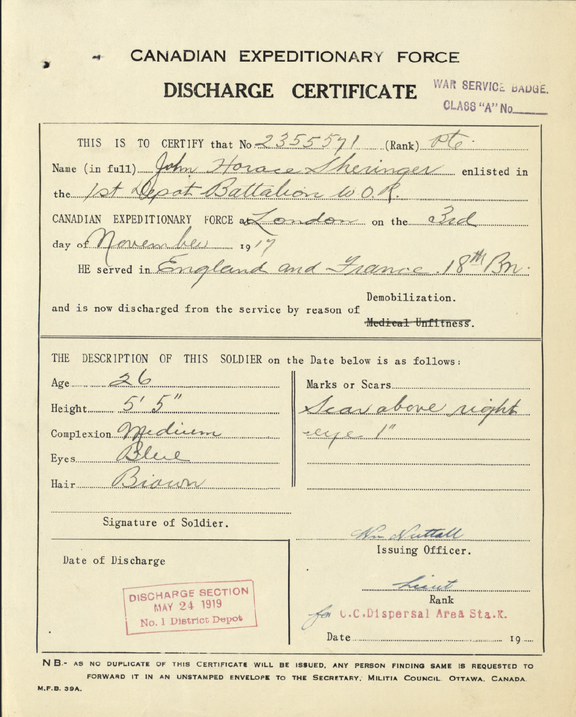 He was discharged due to demobilization on 28 March 1919 at London, Ontario.