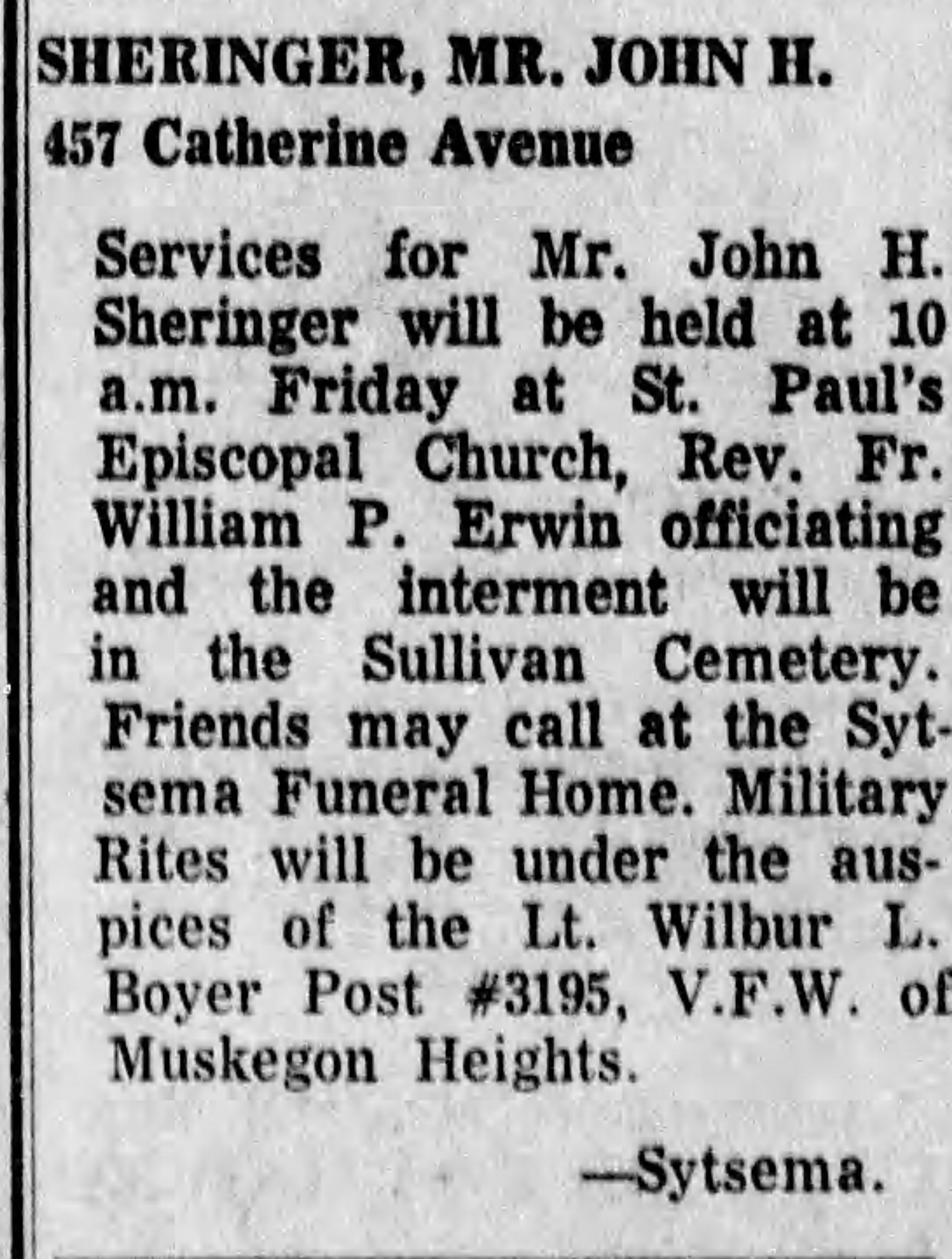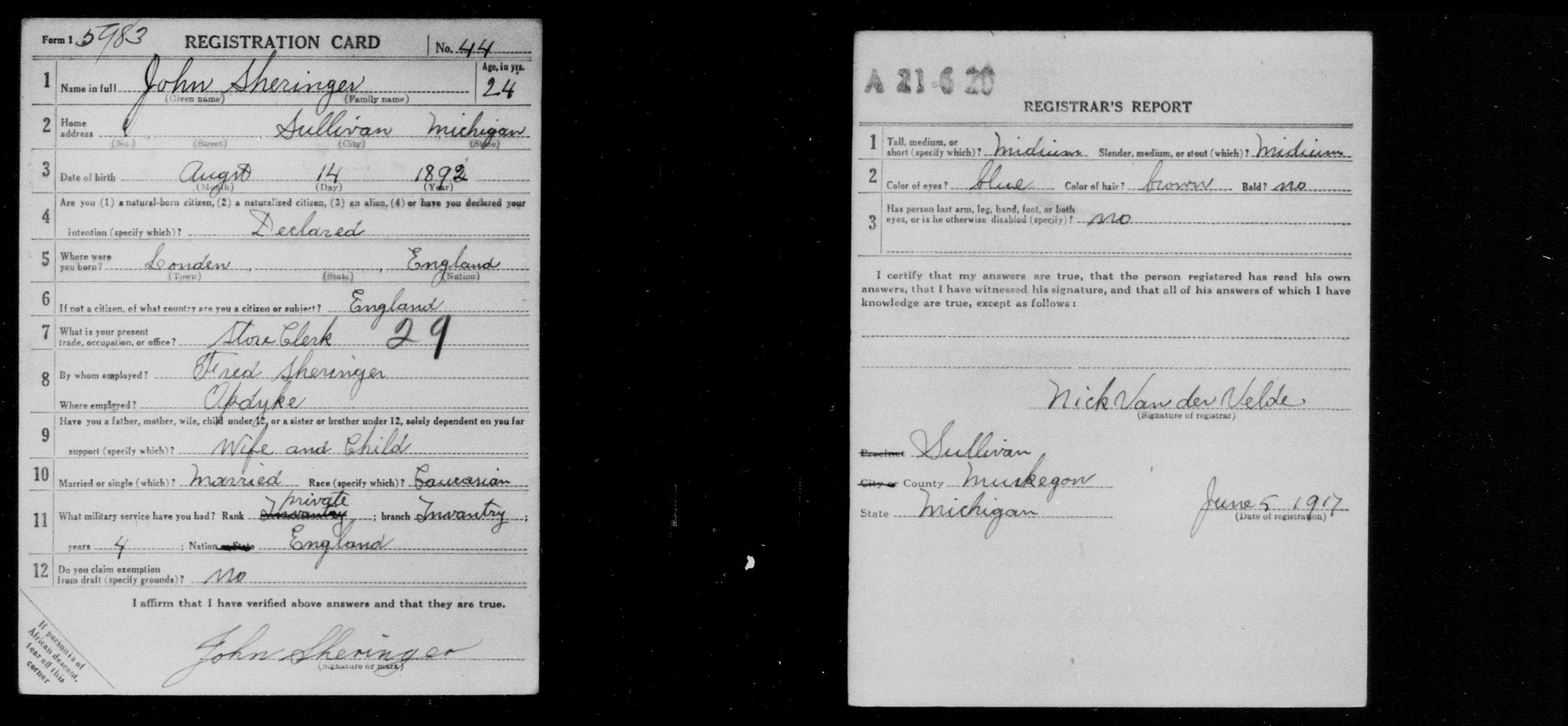 Family Search: Private John Horace Sheringer was born on 14 August 1892, in London, England as the son of Robert Sheringer and Mary Coring. He married Bernice A Botruff on 17 June 1915, in Sullivan, Muskegon, Michigan, United States. They were the parents of at least 1 son and 2 daughters. He immigrated to Vermont, United States in 1919. He registered for military service in 1917. In 1940, his occupation is listed as auto mechanic in Muskegon, Muskegon, Michigan, United States. He died on 23 July 1968, in Muskegon, Muskegon, Michigan, United States, at the age of 75, and was buried in Sullivan Township Cemetery, Ravenna, Muskegon, Michigan, United States.