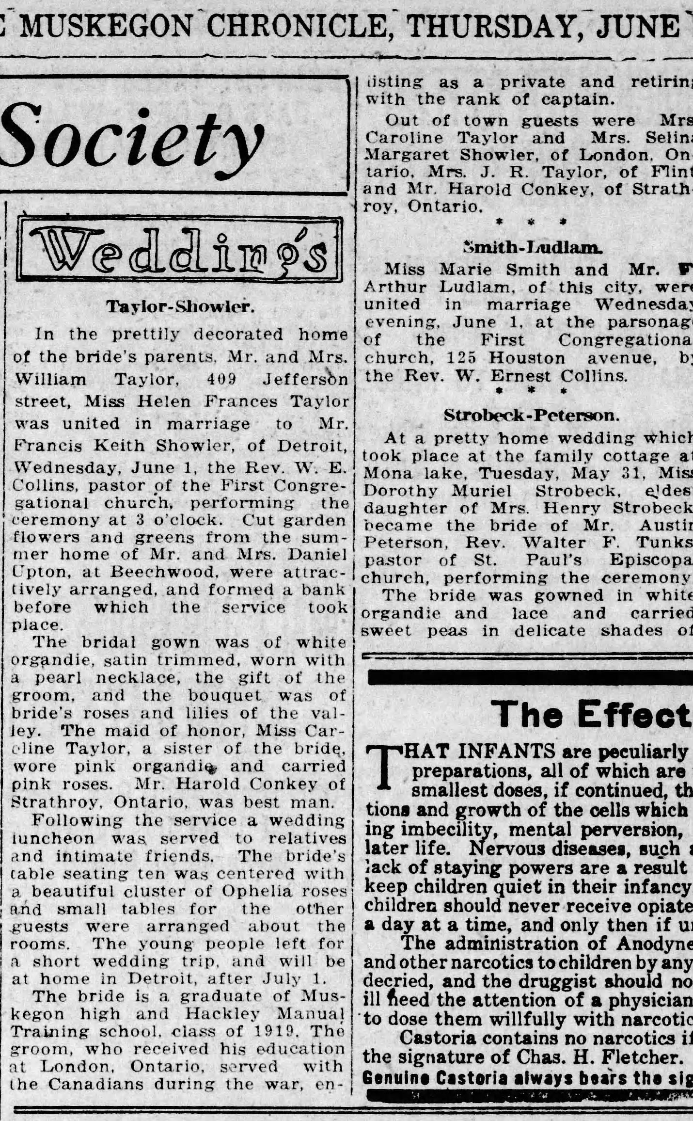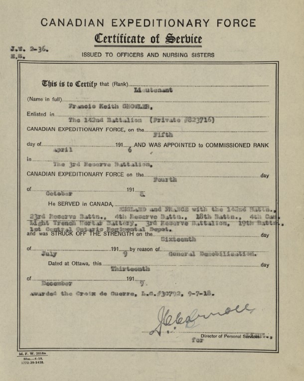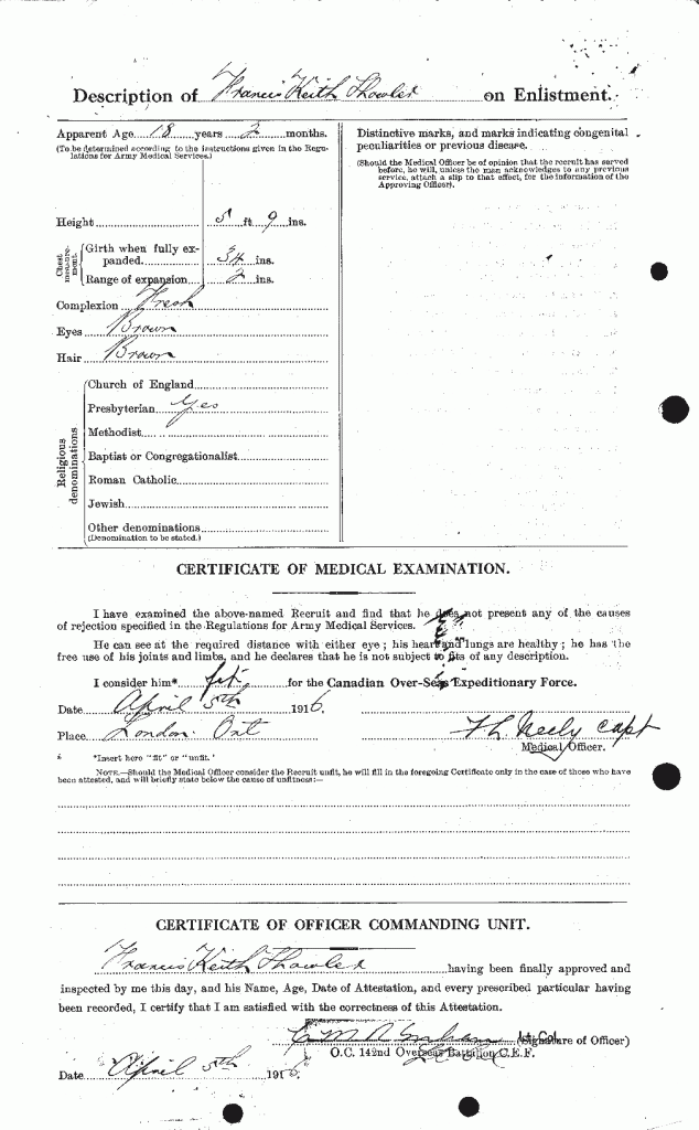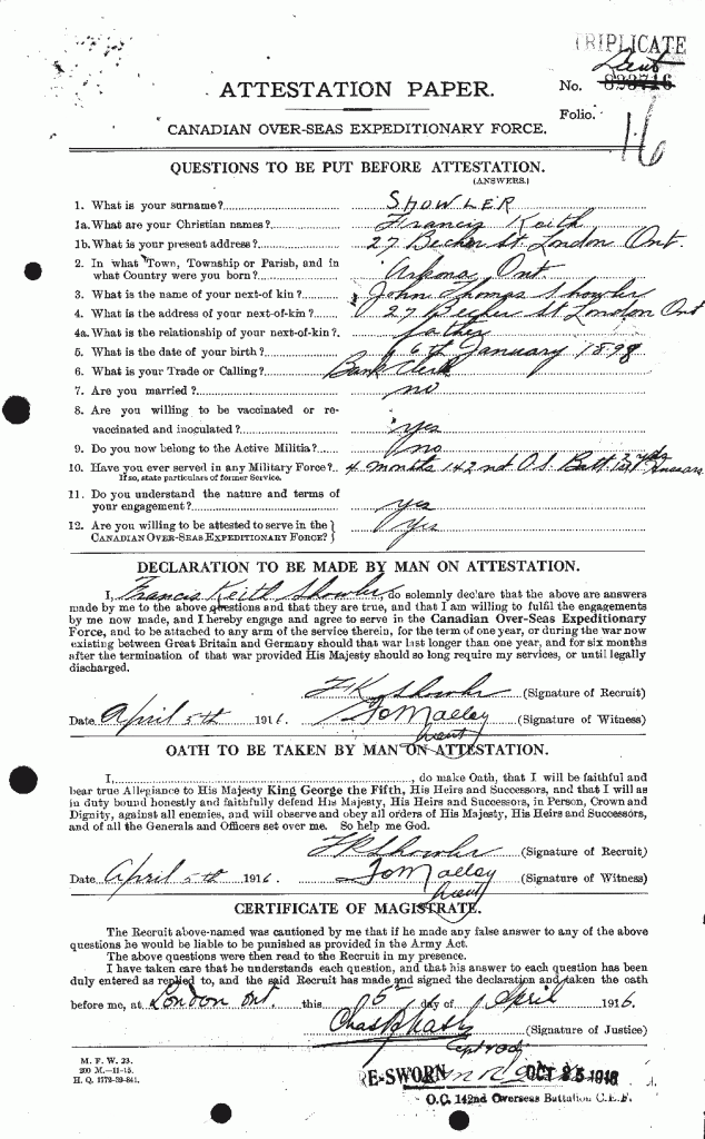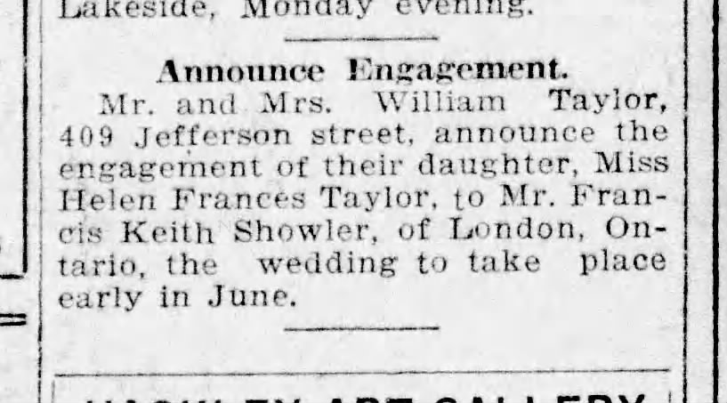 Family Search: When Private Francis Keith Showler was born on 16 January 1898, in Arkona, Lambton, Ontario, Canada, his father, John Thomas Showler, was 38 and his mother, Selena Margaret Thomas, was 38. He married Helen Frances Taylor on 1 June 1921, in Muskegon, Muskegon, Michigan, United States. They were the parents of at least 2 daughters. He immigrated to Detroit, Wayne, Michigan, United States in 1945 and lived in Lincoln Park, Wayne, Michigan, United States in 1935 and Taylor Township, Wayne, Michigan, United States in 1940. He registered for military service in 1916. In 1916, at the age of 18, his occupation is listed as clerk in London, Ontario, Canada. He died on 30 April 1968, in Wayne, Wayne, Michigan, United States, at the age of 70, and was buried in Alban Cemetery, Ypsilanti, Washtenaw, Michigan, United States.