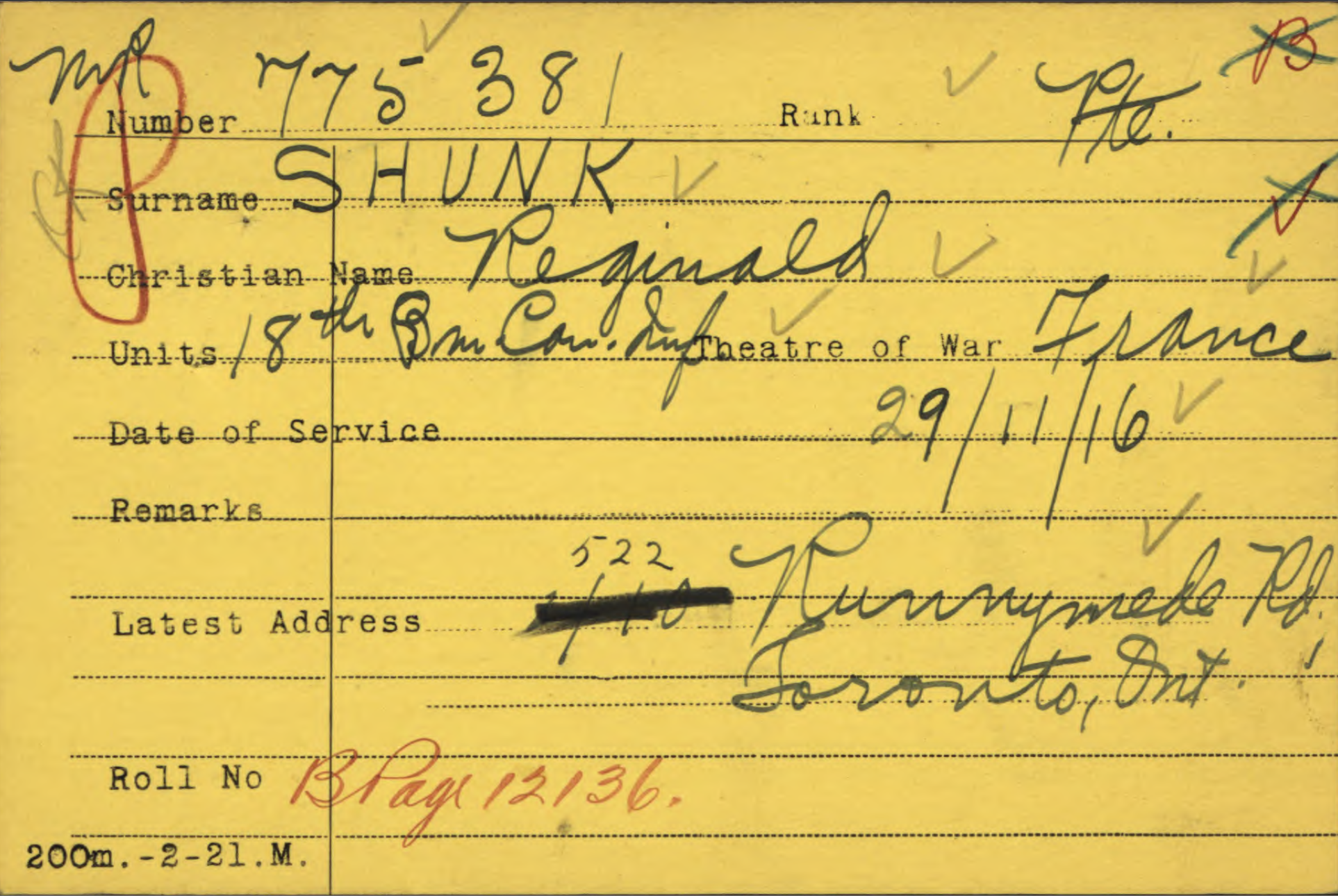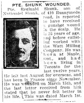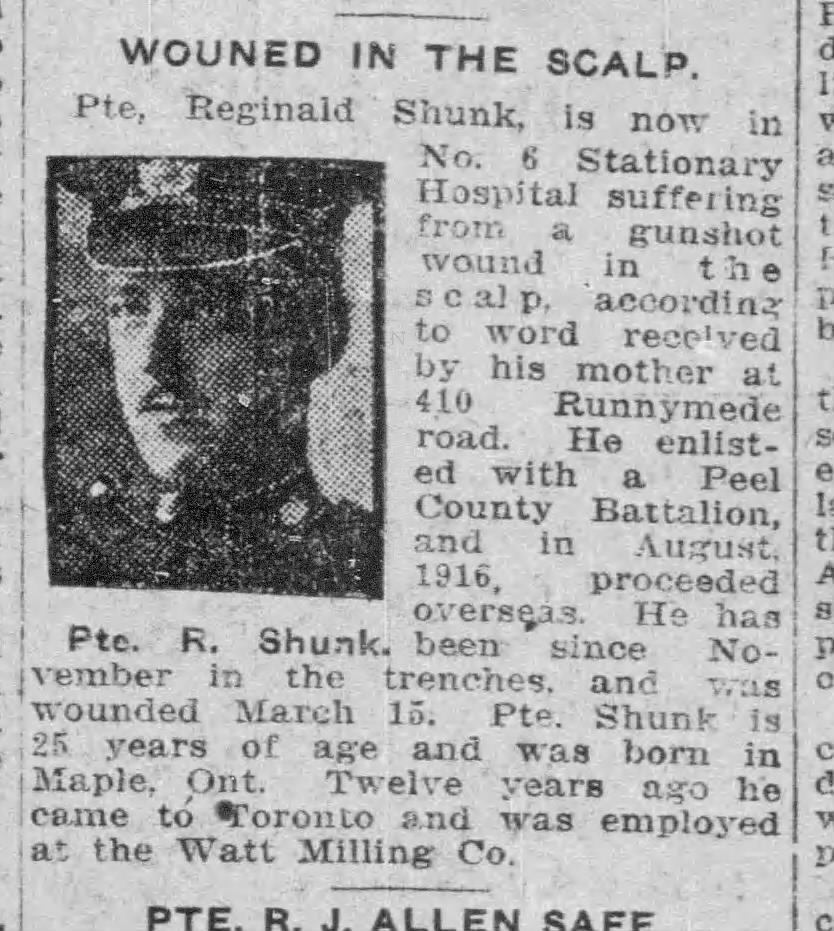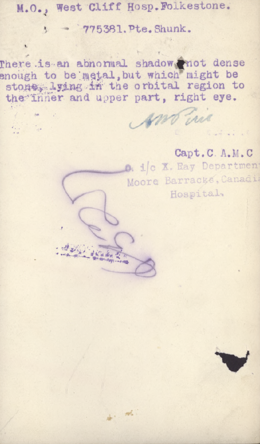 Shunk, Reginald Alexander: Service no. 775381 Digitized Service Record Source: Per news clipping post by David Archer on the 18th Battalion Facebook Page (not group). Find-A-Grave Shunk, Reginald: Service no. 775381. Source: Toronto Telegram. March 1917. Per news clipping post by David Archer at 18th Battalion Facebook Page (not group). X-rays of wound. Share this: Click to email a link to a friend (Opens in new window) Email Click to share on Facebook (Opens in new window) Facebook Click to share on X (Opens in new window) X Click to share on Reddit (Opens in new window) Reddit Click to share on LinkedIn (Opens in new window) LinkedIn Click to print (Opens in new window) Print Click to share on Tumblr (Opens in new window) Tumblr Click to share on Pocket (Opens in new window) Pocket Click to share on Pinterest (Opens in new window) Pinterest Click to share on Telegram (Opens in new window) Telegram Click to share on WhatsApp (Opens in new window) WhatsApp Like Loading...
