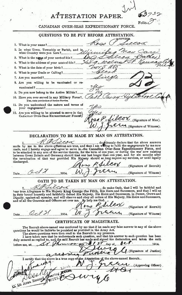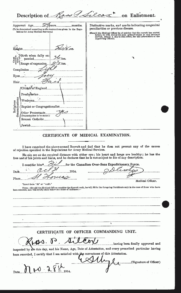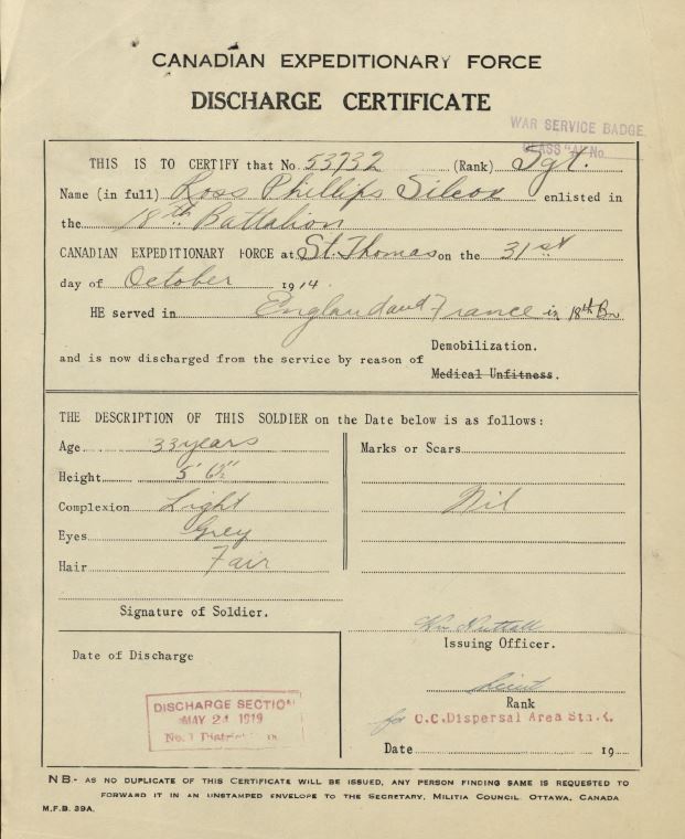 Family Search: When Ross Phillips Silcox was born on 5 November 1885, in Winnipeg, Manitoba, Canada, his father, Rev. John B. Silcox, was 38 and his mother, Esther Ann Brotherhood, was 35. He registered for military service in 1914. In 1914, at the age of 29, his occupation is listed as clerk. He died on 25 March 1954, at the age of 68, and was buried in Saint John’s Anglican Church Cemetery, Richmond Hill, York, Ontario, Canada.