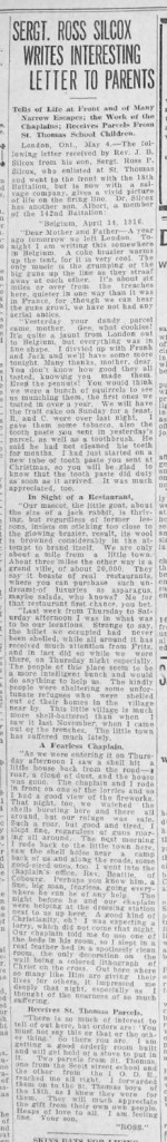 A letter received yesterday by Rev. E. D. Silcox, from his son, Sergt. Ross P. Silcox, was a welcome one. It was written from the front in France, April 14, 1916, and contains many interesting details of life in the trenches. Sergt. Silcox says they are having a rather quiet time just now, but he has seen his share of danger and excitement. He says he has been under shell fire a number of times, but has escaped injury. He tells of a thrilling experience when a German aeroplane flew low over the trenches and dropped bombs. One of these bombs fell within 200 yards of his dugout, but did no damage. He says he is well and happy and is looking forward to the time when he will be able to return home. Sergt. Silcox also writes of the many kindnesses shown to the soldiers by the French people. He says they are very grateful for the support given to them by Canada and England. He also speaks of the splendid work done by the Canadian Red Cross Society and other organizations in looking after the comfort of the soldiers.