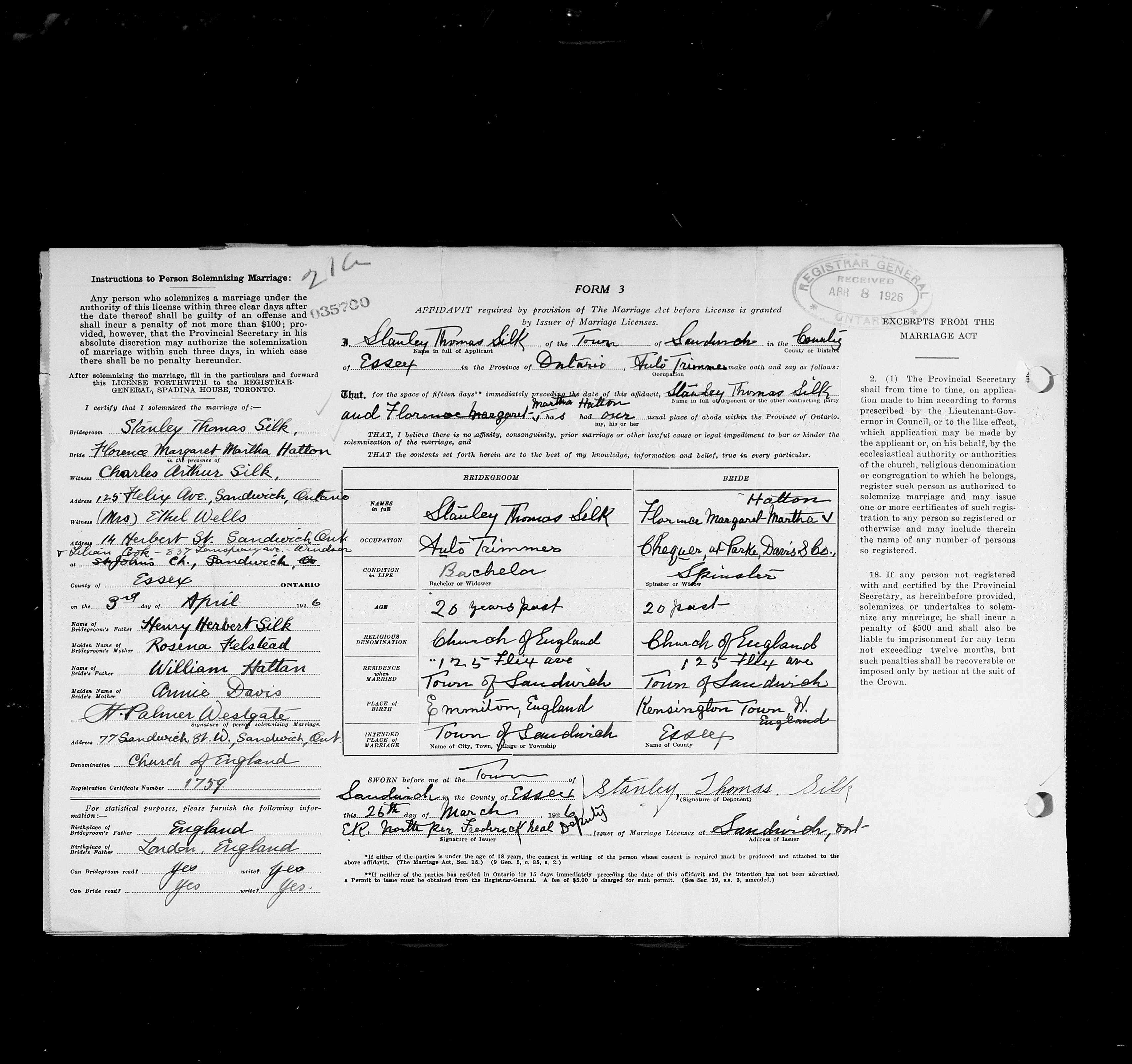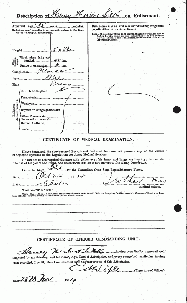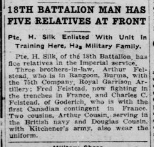 Family Search: When Private Henry Hebert Silk was born on 10 December 1878, in City of London, England, United Kingdom, his father, Henry J G Silk, was 23 and his mother, Martha L Silk, was 22. He had at least 5 sons with Rosina Felstead. He immigrated to Canada in 1911 and lived in Toronto, York, Ontario, Canada in 1919 and Sandwich Township, Essex, Ontario, Canada in 1921. He registered for military service in 1914. In 1914, at the age of 36, his occupation is listed as labourer in Goderich, Huron, Ontario, Canada. He died on 16 December 1942, in Windsor, Essex, Ontario, Canada, at the age of 64, and was buried in Saint John’s Anglican Church Cemetery, Windsor, Essex, Ontario, Canada.