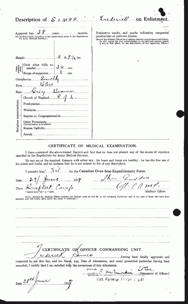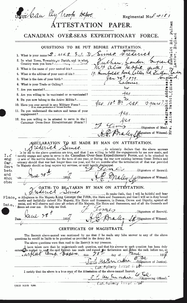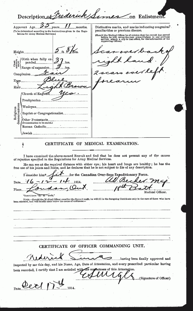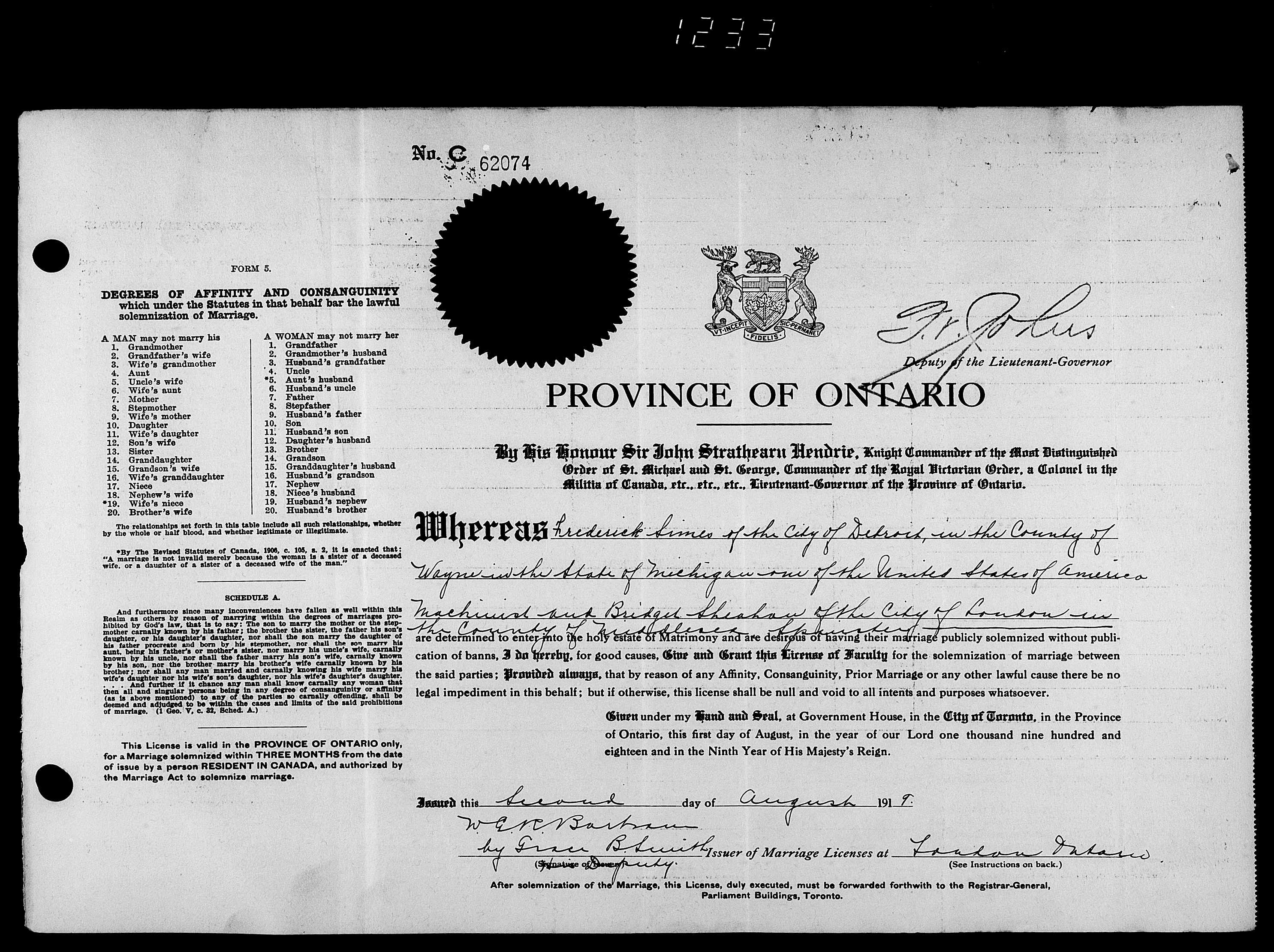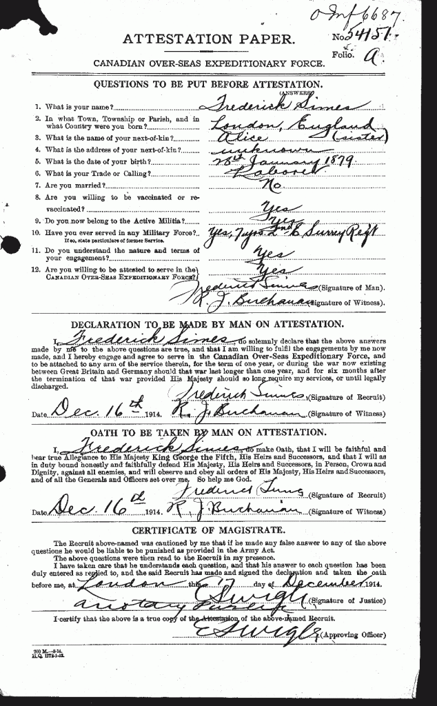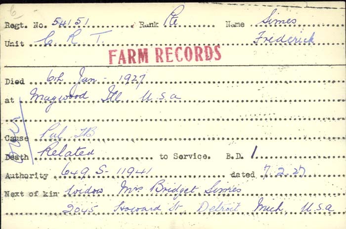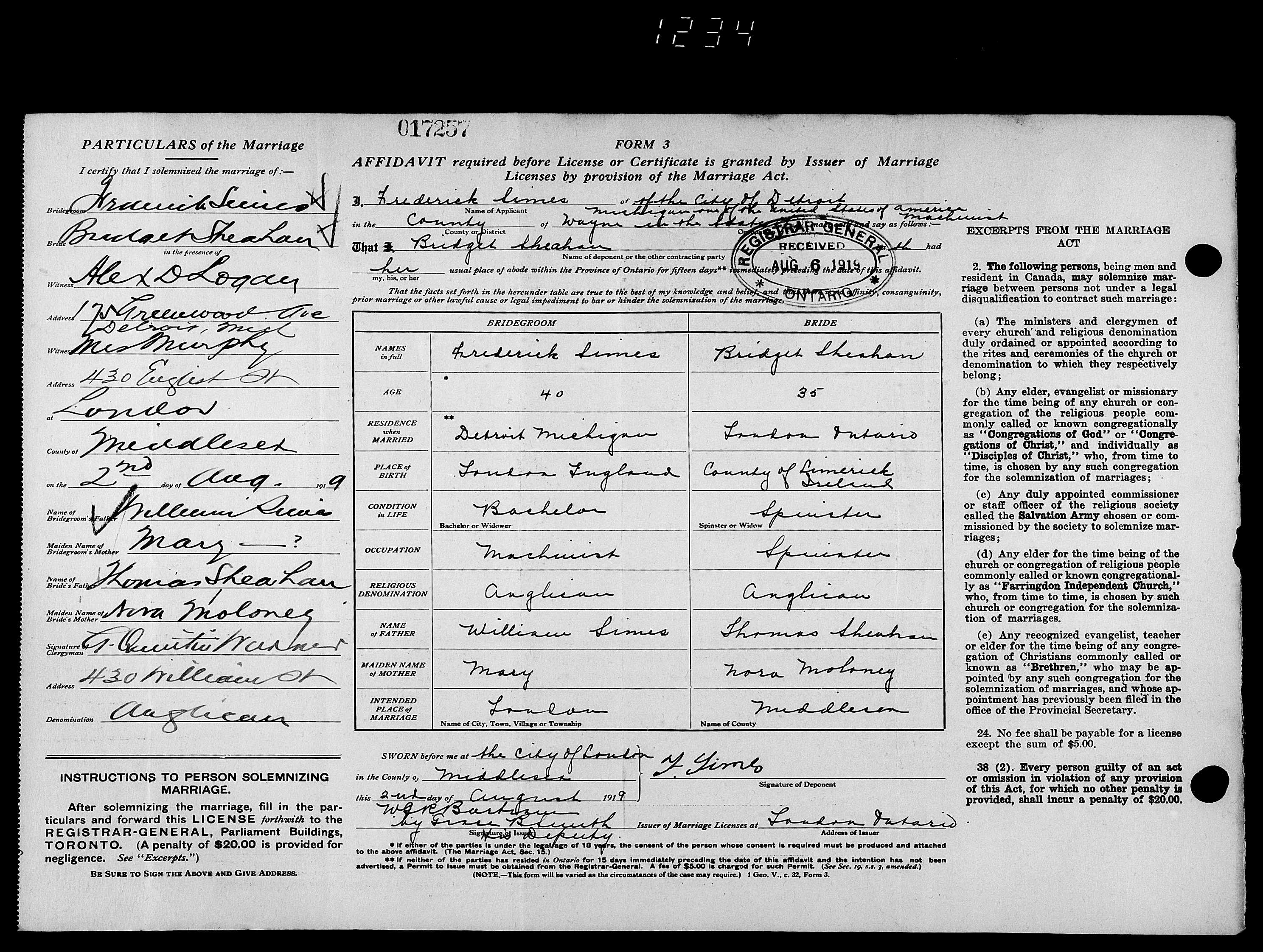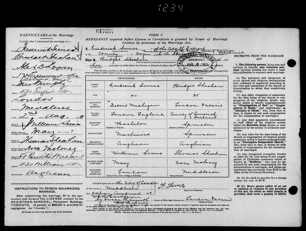 Family Search: When Frederick William George Simes Sr. was born in 1879, in Fulham, Middlesex, England, United Kingdom, his father, William Simes, was 34 and his mother, Mary Hall, was 31. He married Bridget Sheahan on 2 August 1919, in London, Ontario, Canada. They were the parents of at least 1 son and 1 daughter. He lived in Chelsea, London, England, United Kingdom in 1920 and Detroit, Wayne, Michigan, United States for about 5 years. He registered for military service in 1914. In 1919, at the age of 40, his occupation is listed as machinist in Detroit, Wayne, Michigan, United States. He died on 6 January 1927, in Broadview, Proviso Township, Cook, Illinois, United States, at the age of 48, and was buried in Windsor, Essex, Ontario, Canada.