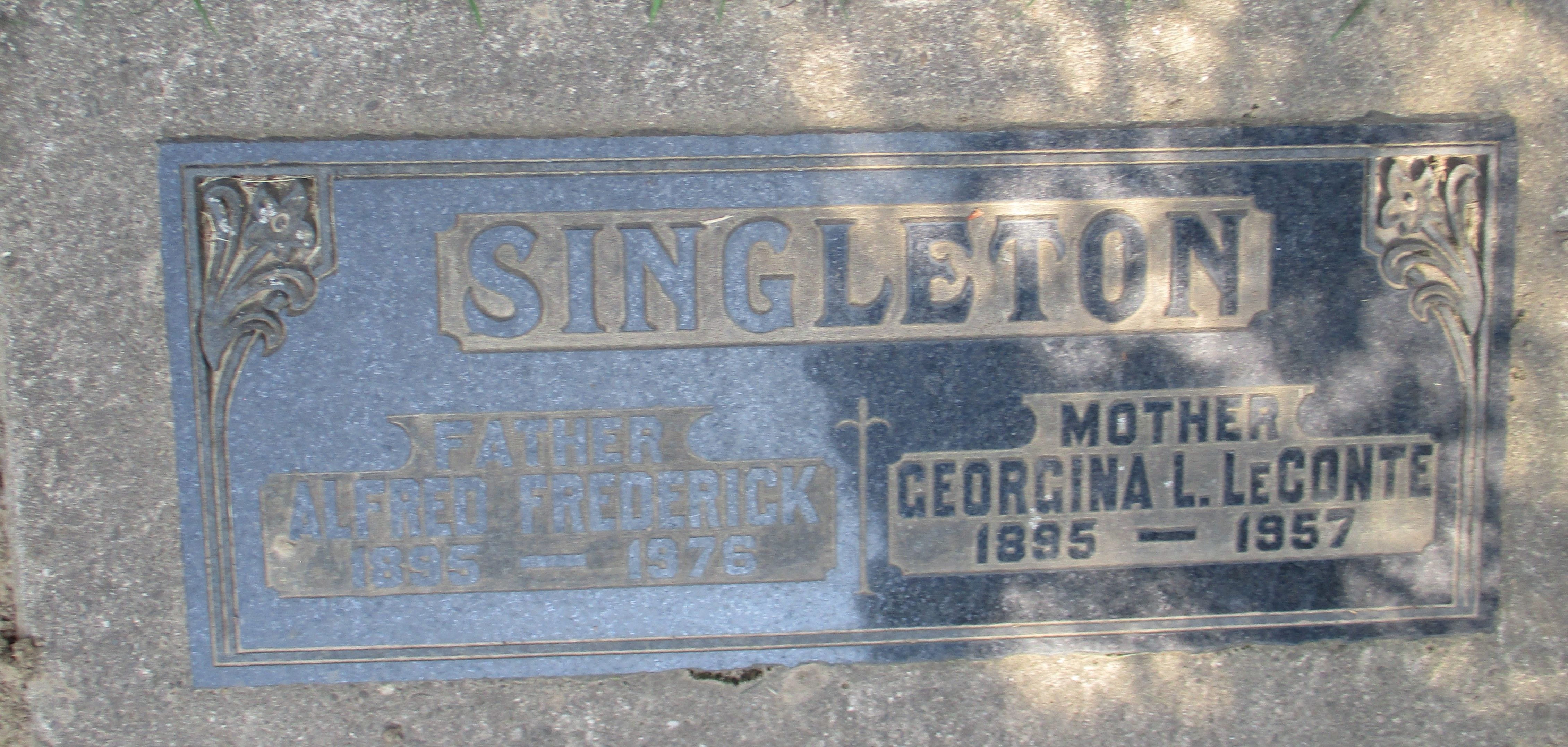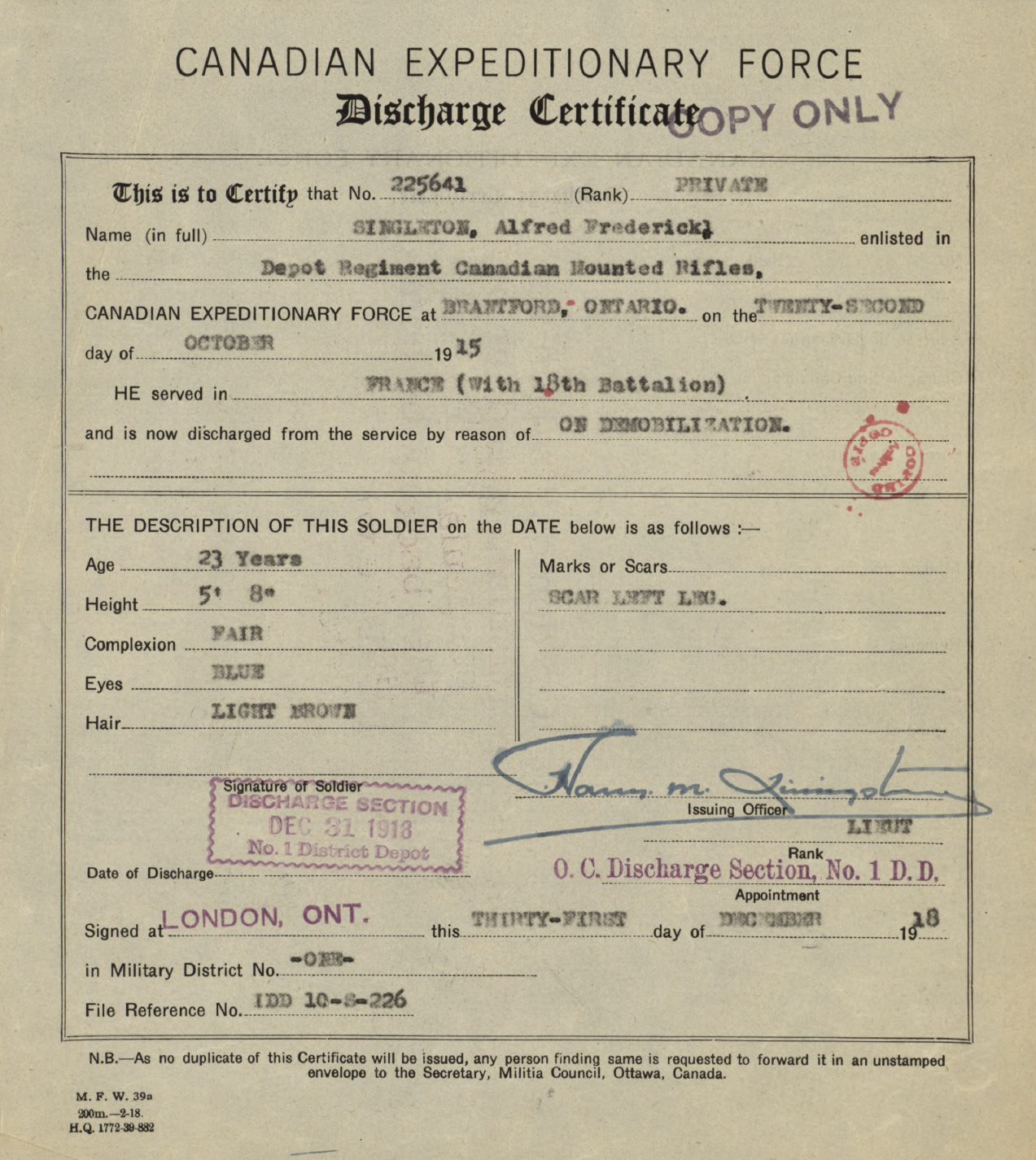 Family Search: When Private Alfred Frederick Singleton was born on 27 August 1895, in Hackney, London, England, United Kingdom, his father, Joseph Frederick Singleton, was 21 and his mother, Elizabeth Mary Ann Le Conte, was 23. He married Georgina Louisa LeConte on 1 August 1925, in Brant, Ontario, Canada. They were the parents of at least 1 son and 1 daughter. He immigrated to Quebec City, Quebec, Canada in 1907 and lived in London, England in 1901 and Brantford, Brant, Ontario, Canada for about 10 years. He registered for military service in 1915. In 1915, at the age of 20, his occupation is listed as farmer. He died on 23 January 1976, in Collingwood, Simcoe, Ontario, Canada, at the age of 80, and was buried in Farringdon Burial Ground, Brantford, Ontario, Canada.