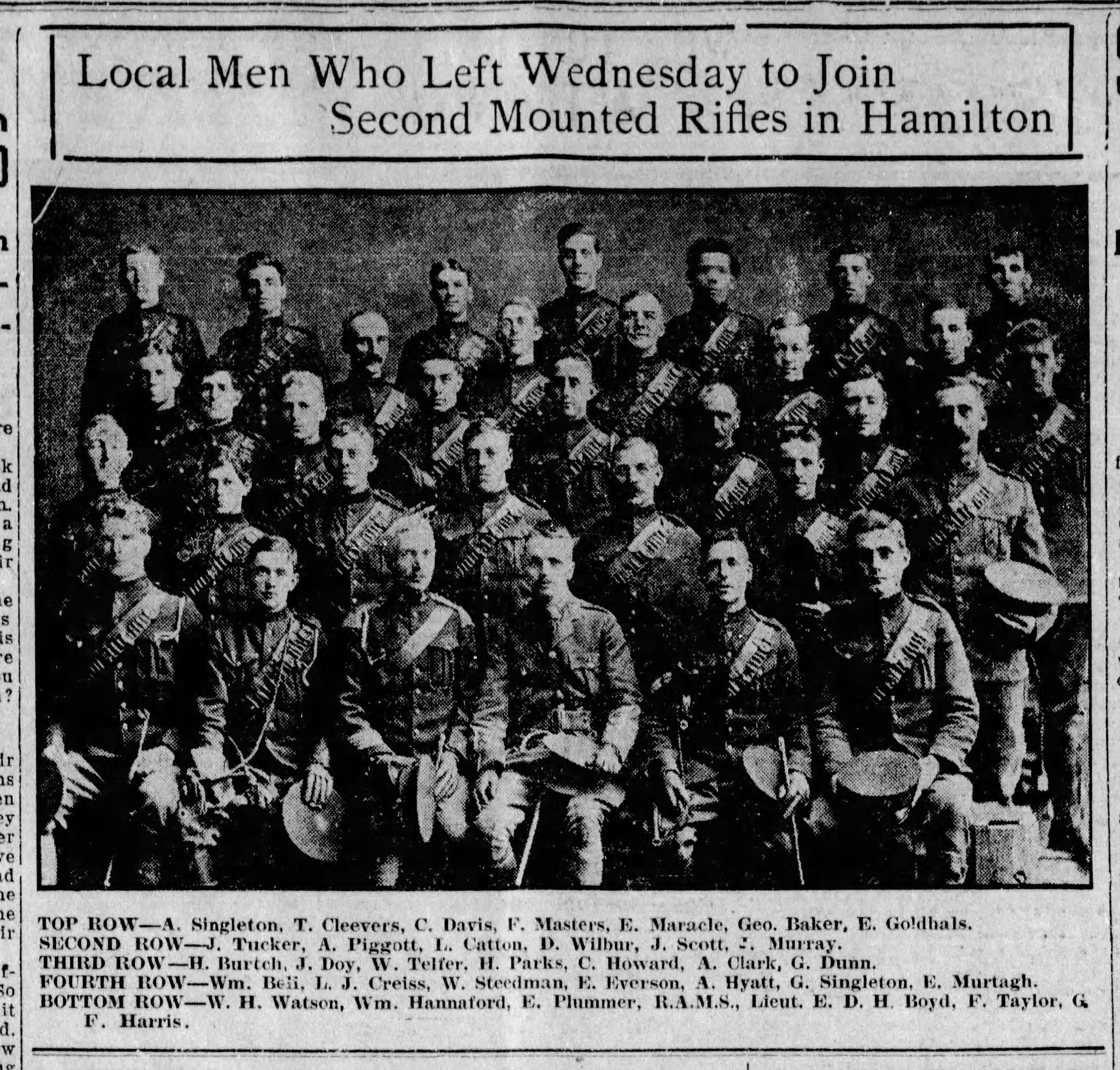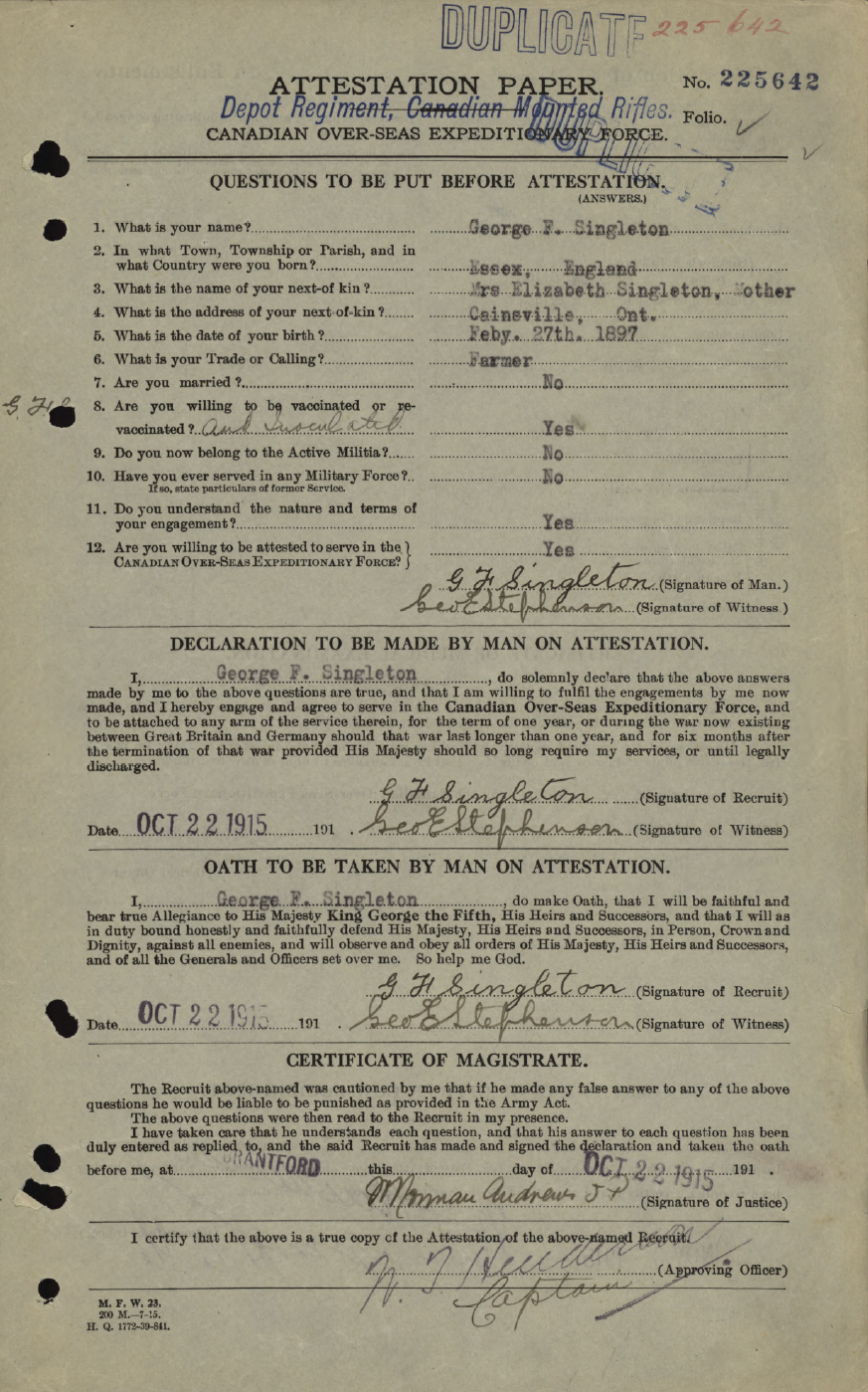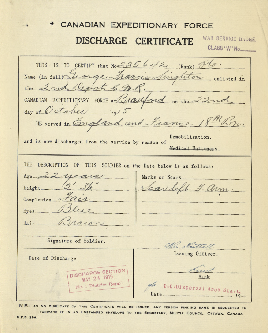 Family Search: When Private George Francis Singleton was born on 27 February 1897, in Hackney, London, England, United Kingdom, his father, Joseph Frederick Singleton, was 23 and his mother, Elizabeth Mary Ann Le Conte, was 24. He married Rose Lovett on 22 August 1925, in Brant, Ontario, Canada. They were the parents of at least 2 sons and 2 daughters. He immigrated to Port Huron, St. Clair, Michigan, United States in 1909 and lived in Brantford, Brant, Ontario, Canada in 1924 and Sarnia, Lambton, Ontario, Canada in 1931. He registered for military service in 1915. In 1931, at the age of 34, his occupation is listed as labourer. He died on 21 July 1955, at the age of 58, and was buried in Resurrection Cemetery, Sarnia, Lambton, Ontario, Canada.