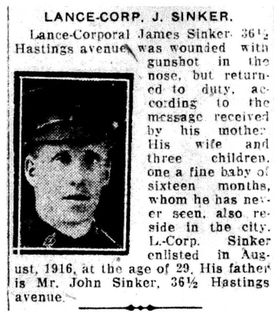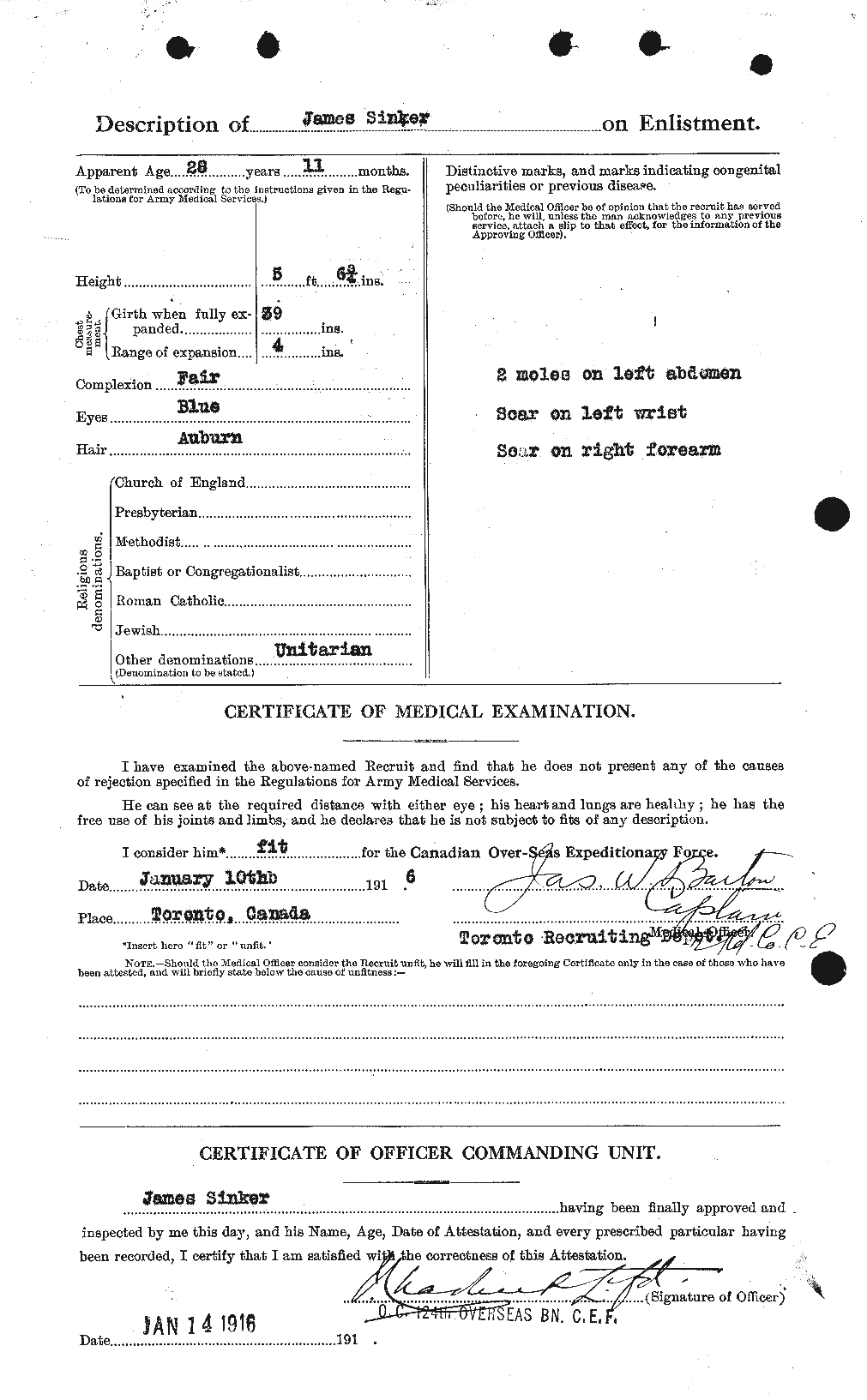 Private Sinker joined the CEF with the 124th Battalion attesting on January 10, 1916, at Toronto, Ontario. He was a 28-year-old oil refinder and was marred to Emily Sinker at the time of his enlistment.