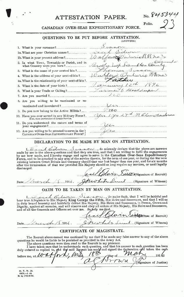 Family Search: When Cecil Edwin Sisson was born on 12 January 1896, in Brooke, Lambton, Ontario, Canada, his father, Thomas Sisson, was 38 and his mother, Katherine Wilson, was 37. He had at least 1 son and 2 daughters with Dorothy Lavina Parker. He lived in Lambton, Ontario, Canada in 1901 and Watford, Warwick, Lambton, Ontario, Canada in 1916. He registered for military service in 1916. In 1916, at the age of 20, his occupation is listed as farmer and bookkeeper. He died on 10 March 1963, in Sarnia, Kent, Ontario, Canada, at the age of 67, and was buried in Grandview Cemetery, Massey, Sudbury, Ontario, Canada.