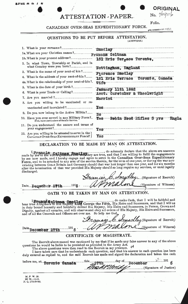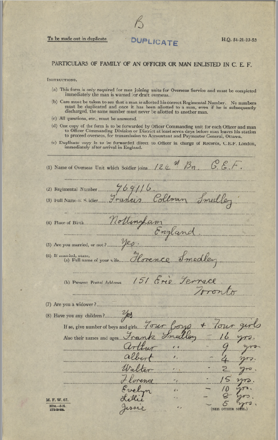 He was TOS the 18th Battalion on 10 October 1916 and after arriving in France was attached to the 2nd Canadian Entrenching Battalion on 5 November 1916. He then was attached 5th Field Company Canadian Engineers on 13 November 1916. On 26 November 1916 he was returned to the 2nd Cdn. Entrenching Battalion until 17 January 1917 when he was attached to the 14th Canadian Machine Gun Company. He returned to the entrenching battalion on 27 February 1917 and was to then go to the 18th Battalion on 5 March 1917.