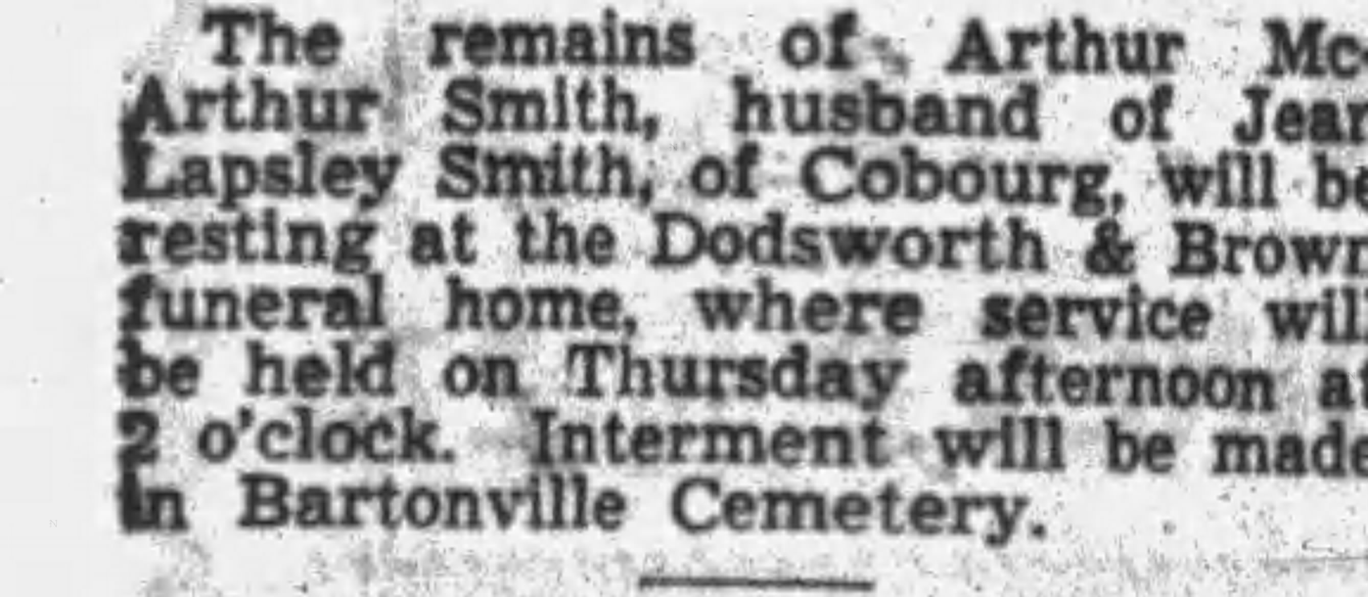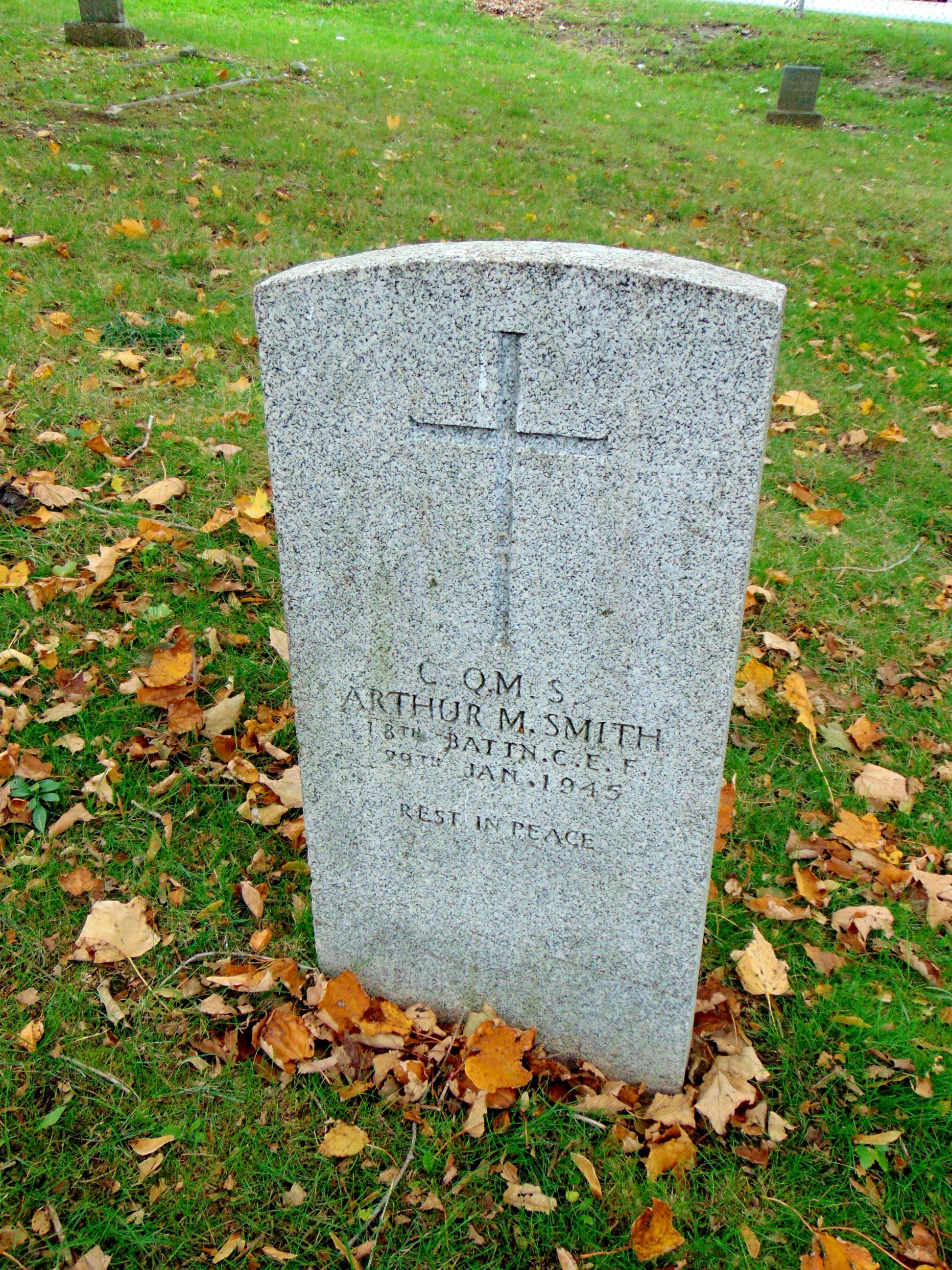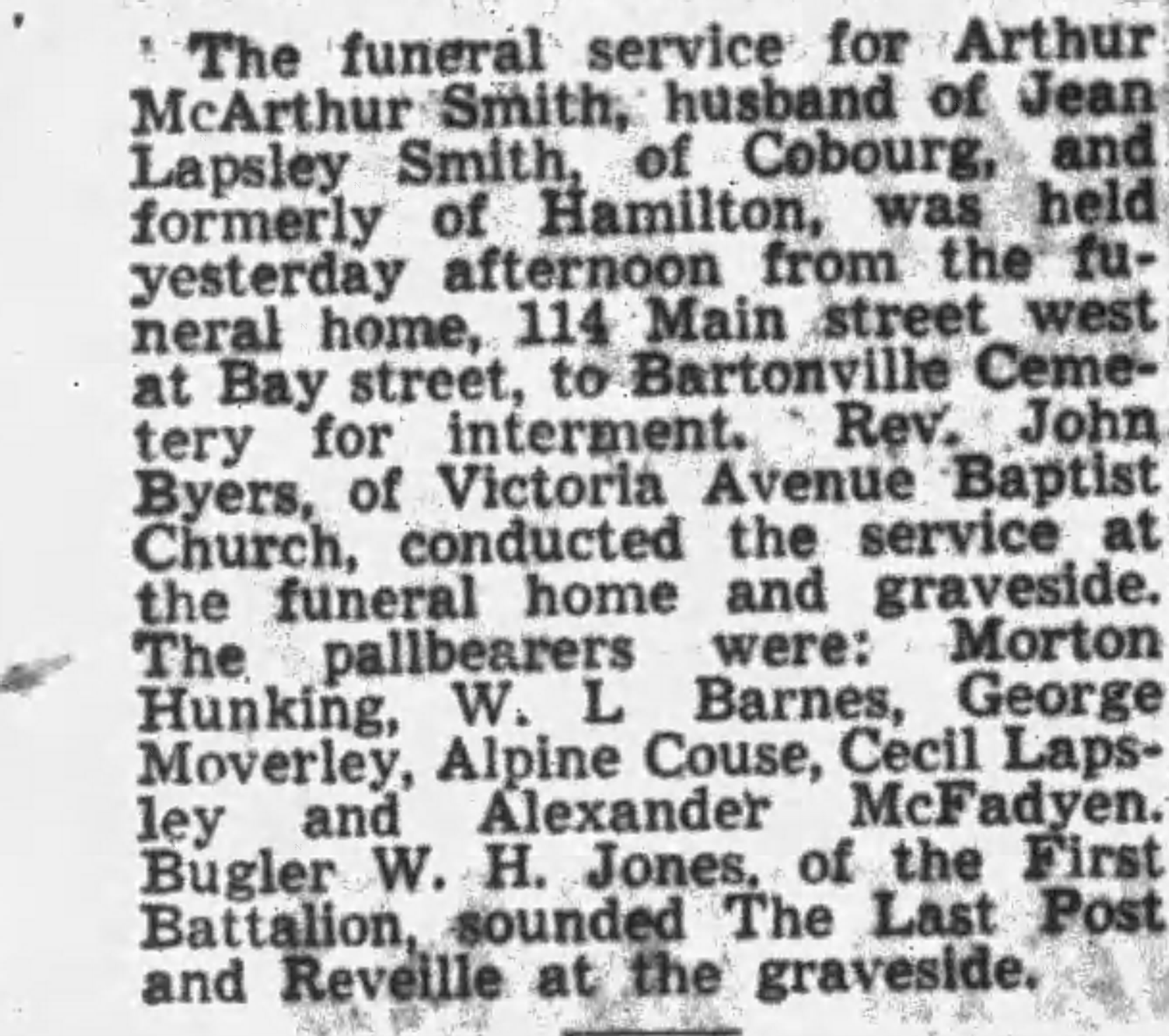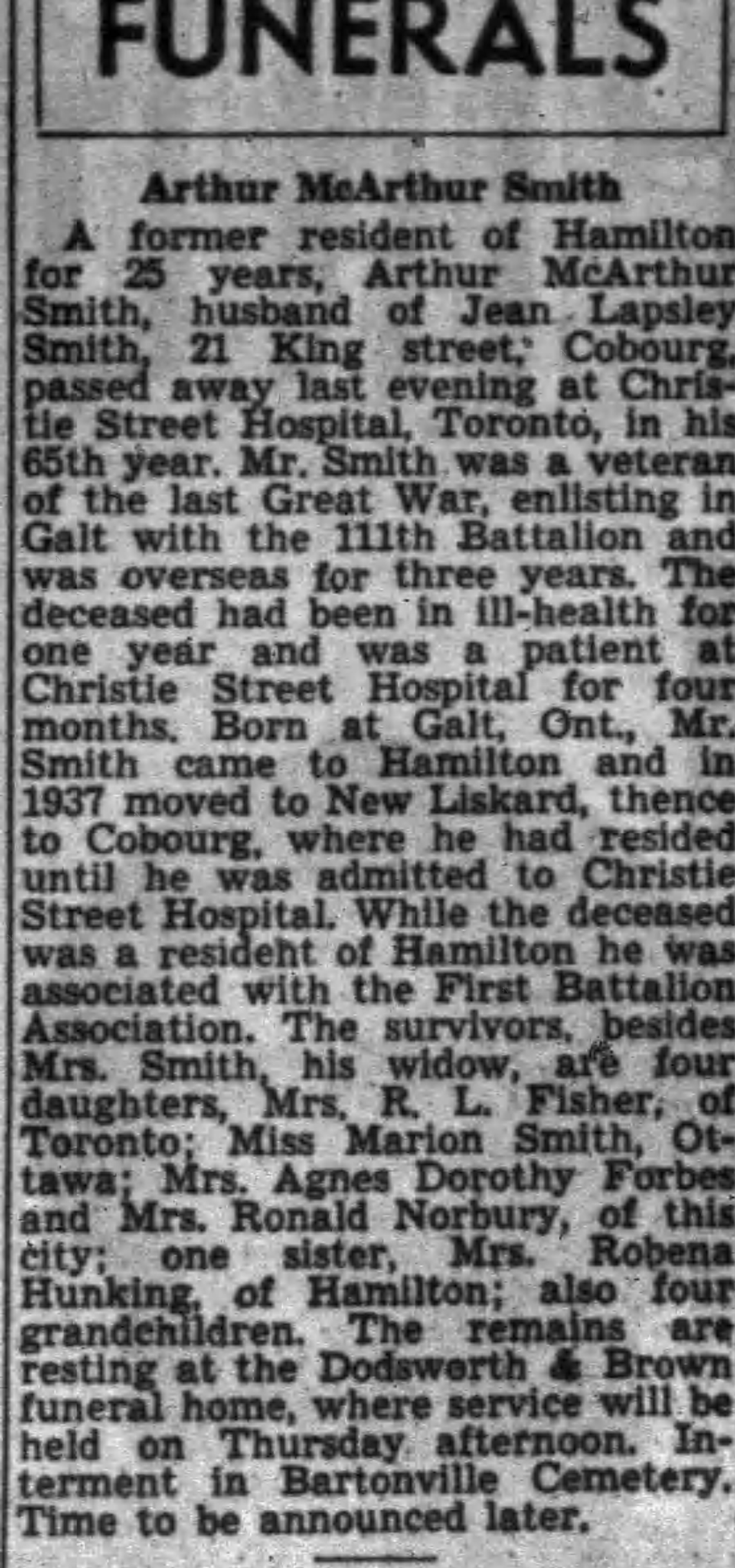 Family Search: When QMS Arthur McArthur Smith was born on 5 February 1880, in Galt, Waterloo, Ontario, Canada, his father, Thomas Smith, was 38 and his mother, Mary Crooks Morton, was 37. He married Jennie Ethline Lopsley on 14 October 1903, in Wentworth, Ontario, Canada. They were the parents of at least 6 daughters. He lived in Hamilton, Hamilton-Wentworth, Ontario, Canada in 1931 and New Liskeard, Timiskaming, Ontario, Canada in 1937. He registered for military service in 1916. In 1931, at the age of 51, his occupation is listed as presser in Hamilton, Wentworth, Ontario, Canada. He died on 29 January 1945, in Toronto, Ontario, Canada, at the age of 64, and was buried in Bartonville Cemetery, Bartonville, Hamilton, Hamilton-Wentworth, Ontario, Canada.