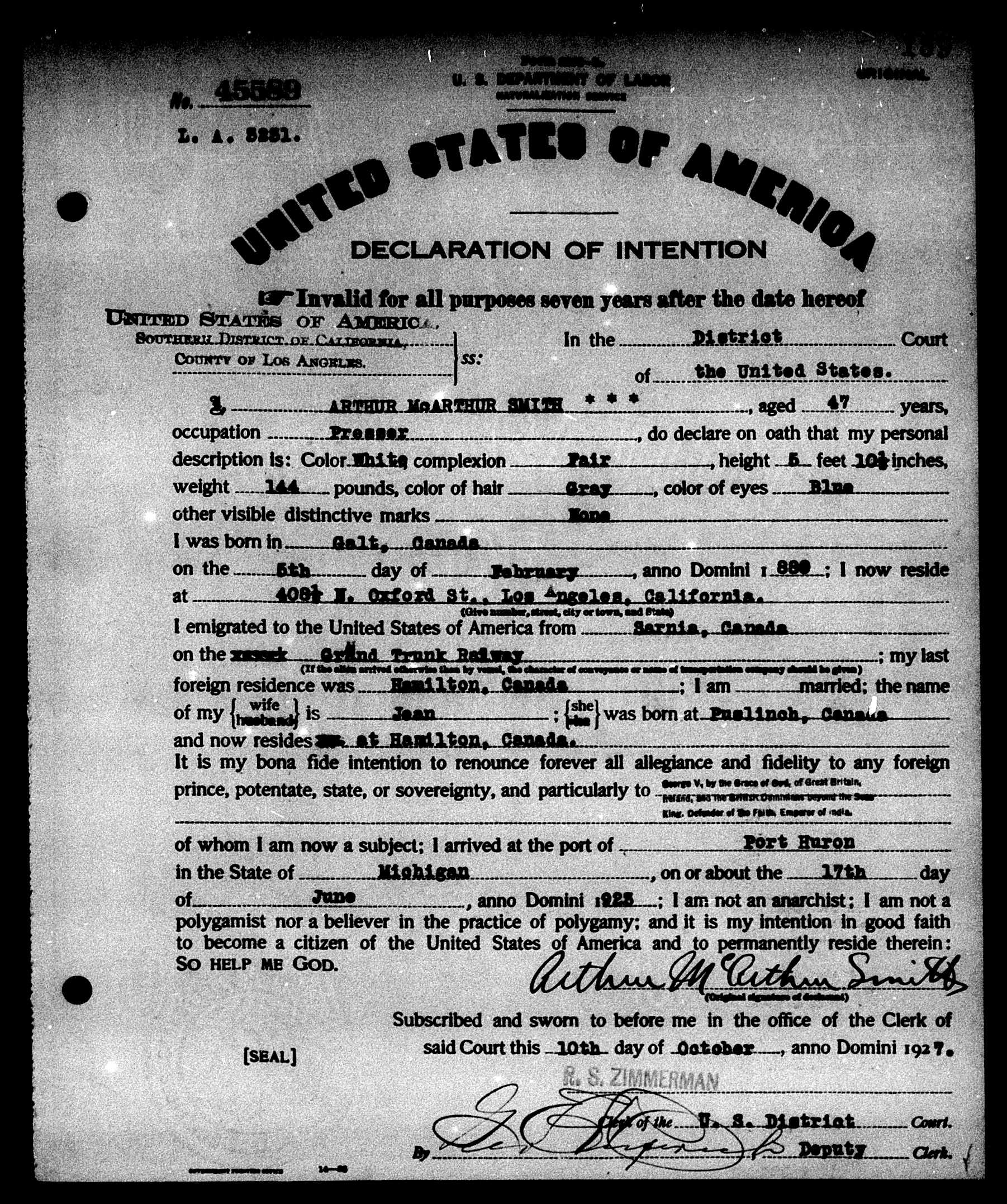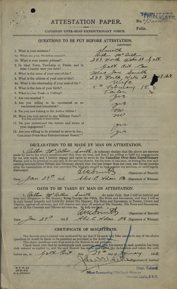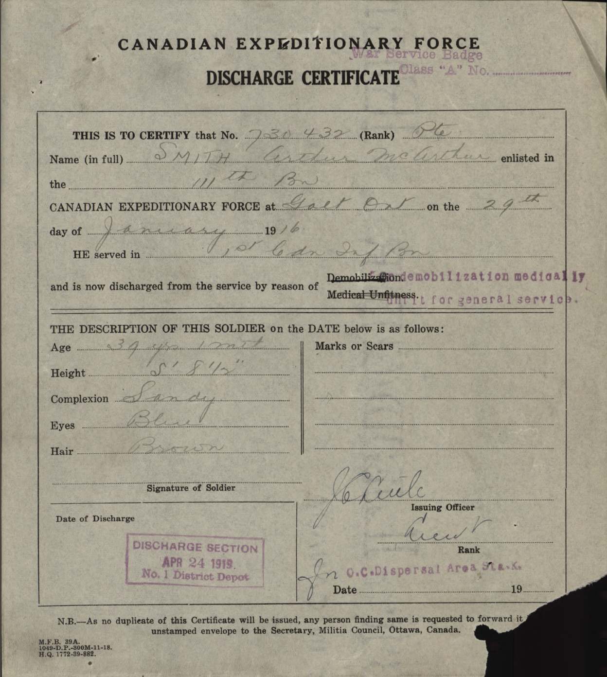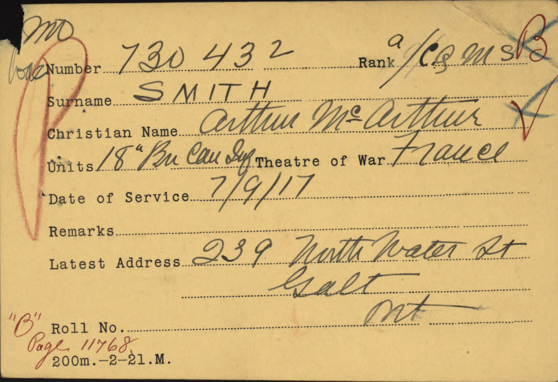 Family Search: When QMS Arthur McArthur Smith was born on 5 February 1880, in Galt, Waterloo, Ontario, Canada, his father, Thomas Smith, was 38 and his mother, Mary Crooks Morton, was 37. He married Jennie Ethline Lopsley on 14 October 1903, in Wentworth, Ontario, Canada. They were the parents of at least 6 daughters. He lived in Hamilton, Hamilton-Wentworth, Ontario, Canada in 1931 and New Liskeard, Timiskaming, Ontario, Canada in 1937. He registered for military service in 1916. In 1931, at the age of 51, his occupation is listed as presser in Hamilton, Wentworth, Ontario, Canada. He died on 29 January 1945, in Toronto, Ontario, Canada, at the age of 64, and was buried in Bartonville Cemetery, Bartonville, Hamilton, Hamilton-Wentworth, Ontario, Canada.