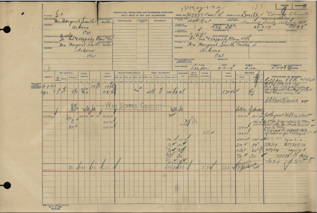 Family Search: When Private Edward Clement Smith was born on 24 May 1897, in Arkona, Lambton, Ontario, Canada, his father, David E. Smith, was 42 and his mother, Margaret Murray, was 33. He married Alice E Bracknell on 25 January 1921, in Minden City, Minden Township, Sanilac, Michigan, United States. They were the parents of at least 1 son and 1 daughter. He lived in Detroit, Ward 22, Detroit, Wayne, Michigan, United States in 1940 and Detroit, Wayne, Michigan, United States in 1942. He registered for military service in 1915. In 1942, at the age of 45, his occupation is listed as Evans Products in Detroit, Wayne, Michigan, United States. He died on 18 January 1986, in Harbor Beach, Huron, Michigan, United States, at the age of 88, and was buried in Arkona Cemetery, Arkona, Lambton, Ontario, Canada.