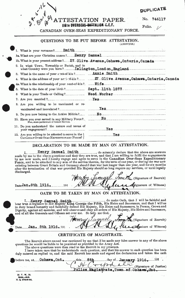 Family Search: Private Henry Samuel Smith was born on 11 September 1877, in Islington, London, England, United Kingdom. He had at least 3 sons and 4 daughters with Annie Russell Smith. He immigrated to Canada in 1913 and lived in Oshawa, Durham, Ontario, Canada for about 6 years. He registered for military service in 1916. In 1916, at the age of 39, his occupation is listed as woodworker in Oshawa, Durham, Ontario, Canada. He died on 16 January 1963, in Toronto, Ontario, Canada, at the age of 85, and was buried in Oshawa Union Cemetery, Oshawa, Ontario, Ontario, Canada.