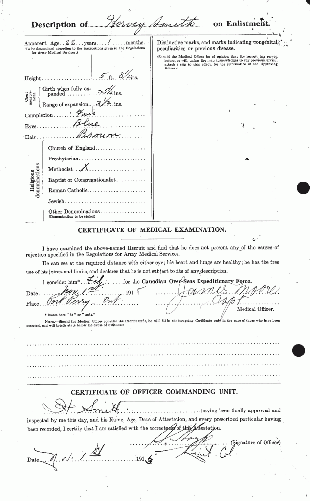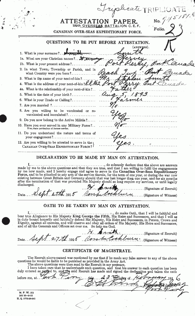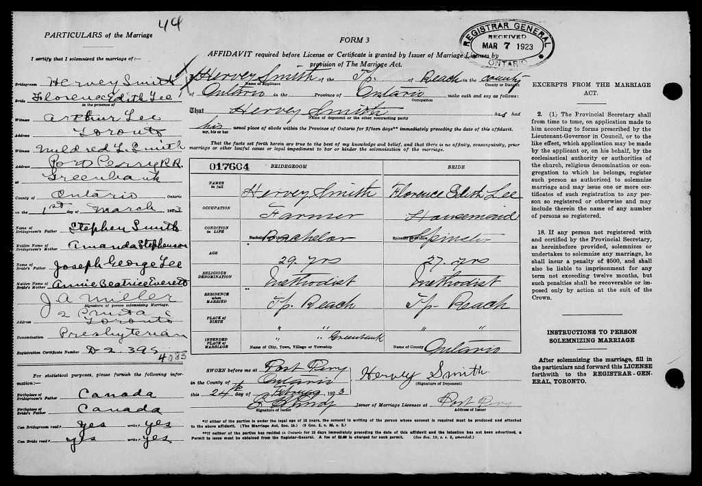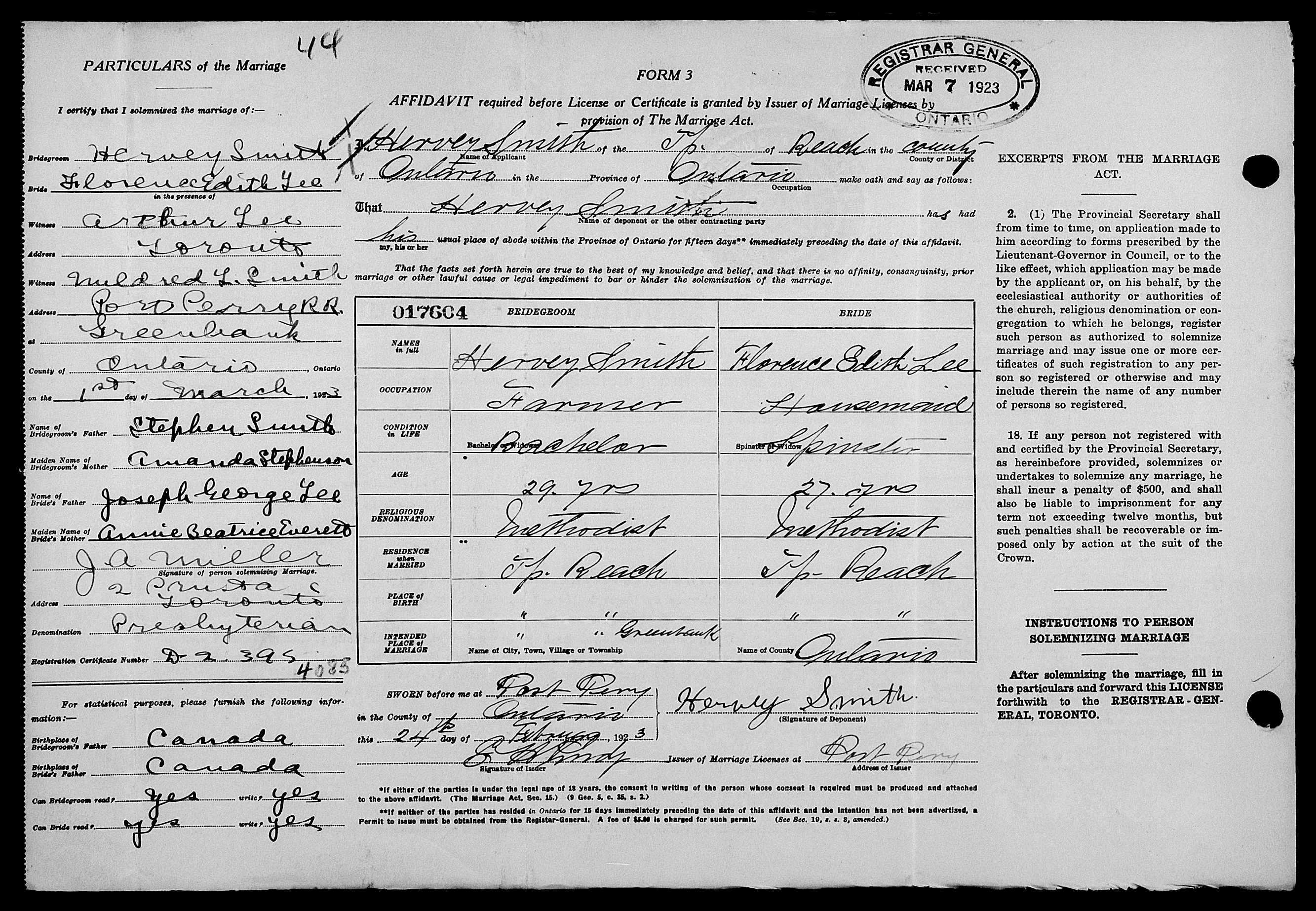Family Search: When Hervey Smith was born on 4 August 1893, in Ontario, Ontario, Canada, his father, Stephen Smith, was 44 and his mother, Amanda Demeretta Stephenson, was 40. He married Edith Florence Lee on 1 March 1923, in Ontario, Ontario, Canada. They were the parents of at least 2 sons. He lived in Port Perry, Durham, Ontario, Canada in 1916. He registered for military service in 1916. In 1916, at the age of 23, his occupation is listed as farmer in Port Perry, Durham, Ontario, Canada. He died on 28 July 1975, in Lindsay, Kawartha Lakes, Ontario, Canada, at the age of 81, and was buried in Bethel Cemetery, Greenbank, Scugog, Durham, Ontario, Canada.