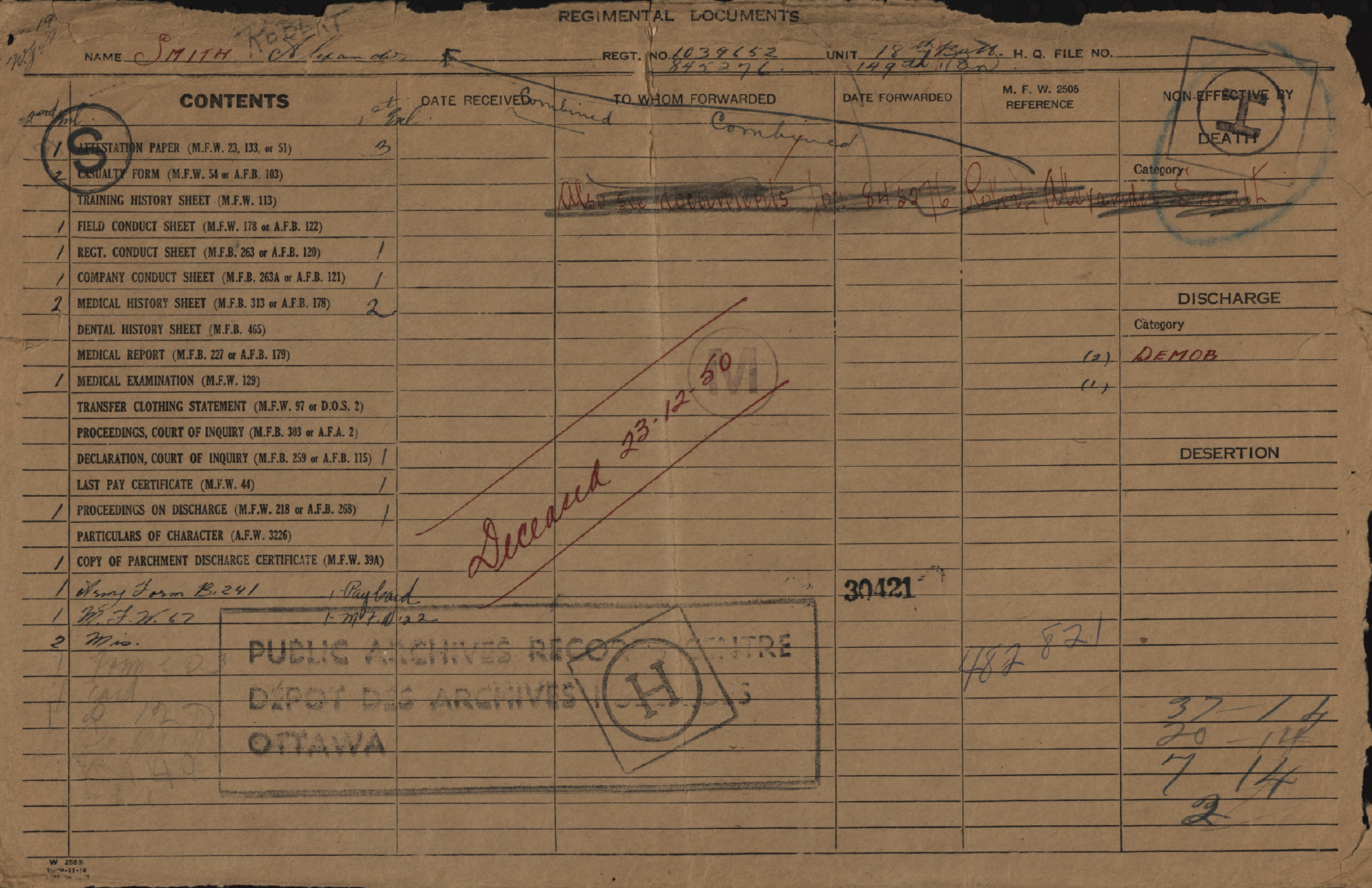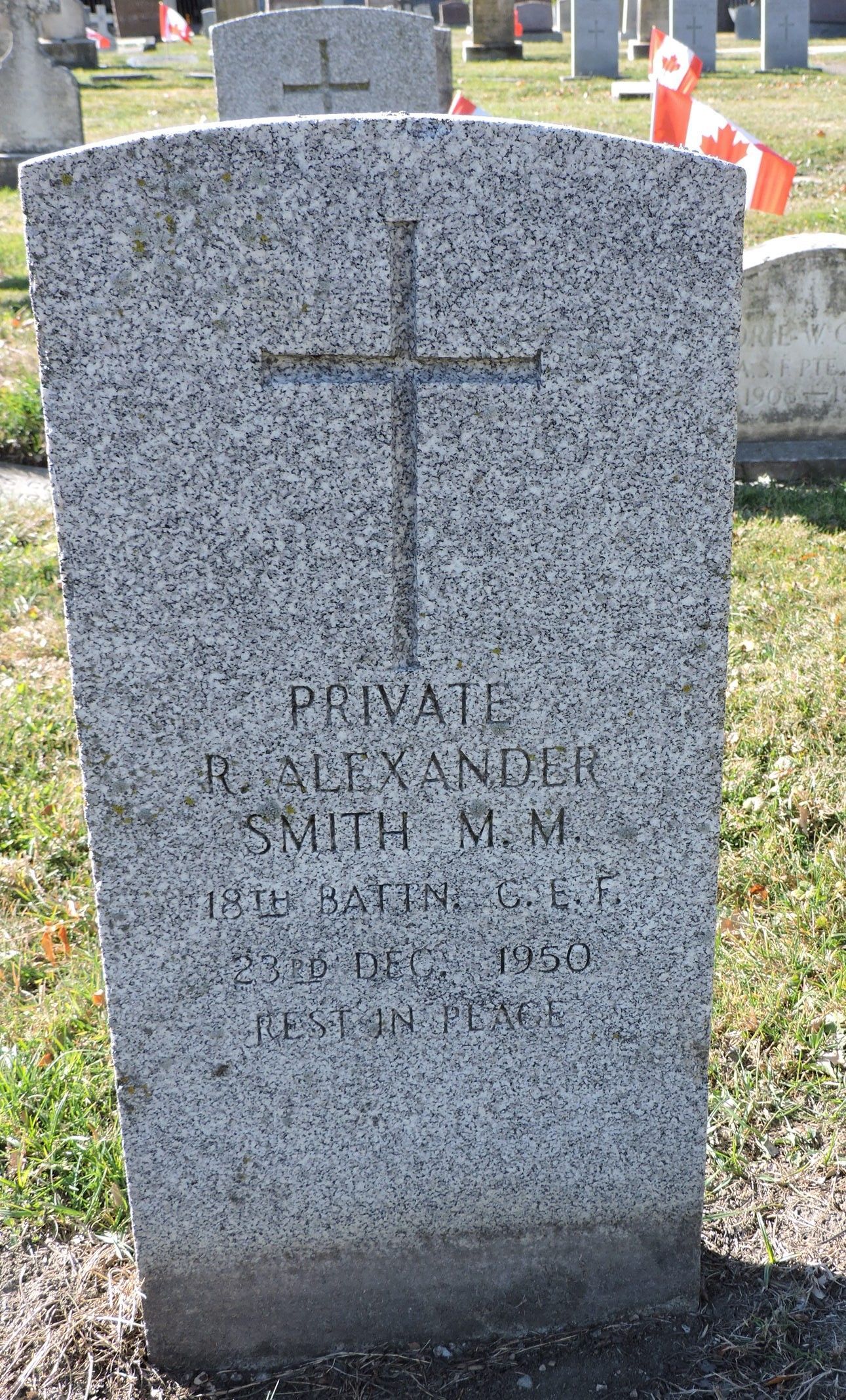 Family Search: When Private Robert Alexander Smith was born on 2 March 1893, in Moore, Lambton, Canada West, British North America, his father, Robert John Smith, was 29 and his mother, Elizabeth White, was 27. He married Muriel Beatrice O’Neil on 23 December 1926, in Essex, Ontario, Canada. They were the parents of at least 4 sons and 1 daughter. He lived in Lambton, Ontario, Canada for about 10 years. He registered for military service in 1916. In 1950, at the age of 57, his occupation is listed as builder contractor, belcrest development company in Sarnia, Lambton, Ontario, Canada. He died on 23 December 1950, in London, Ontario, Canada, at the age of 57, and was buried in Windsor Grove Cemetery, Windsor, Essex, Ontario, Canada.