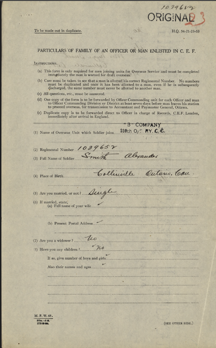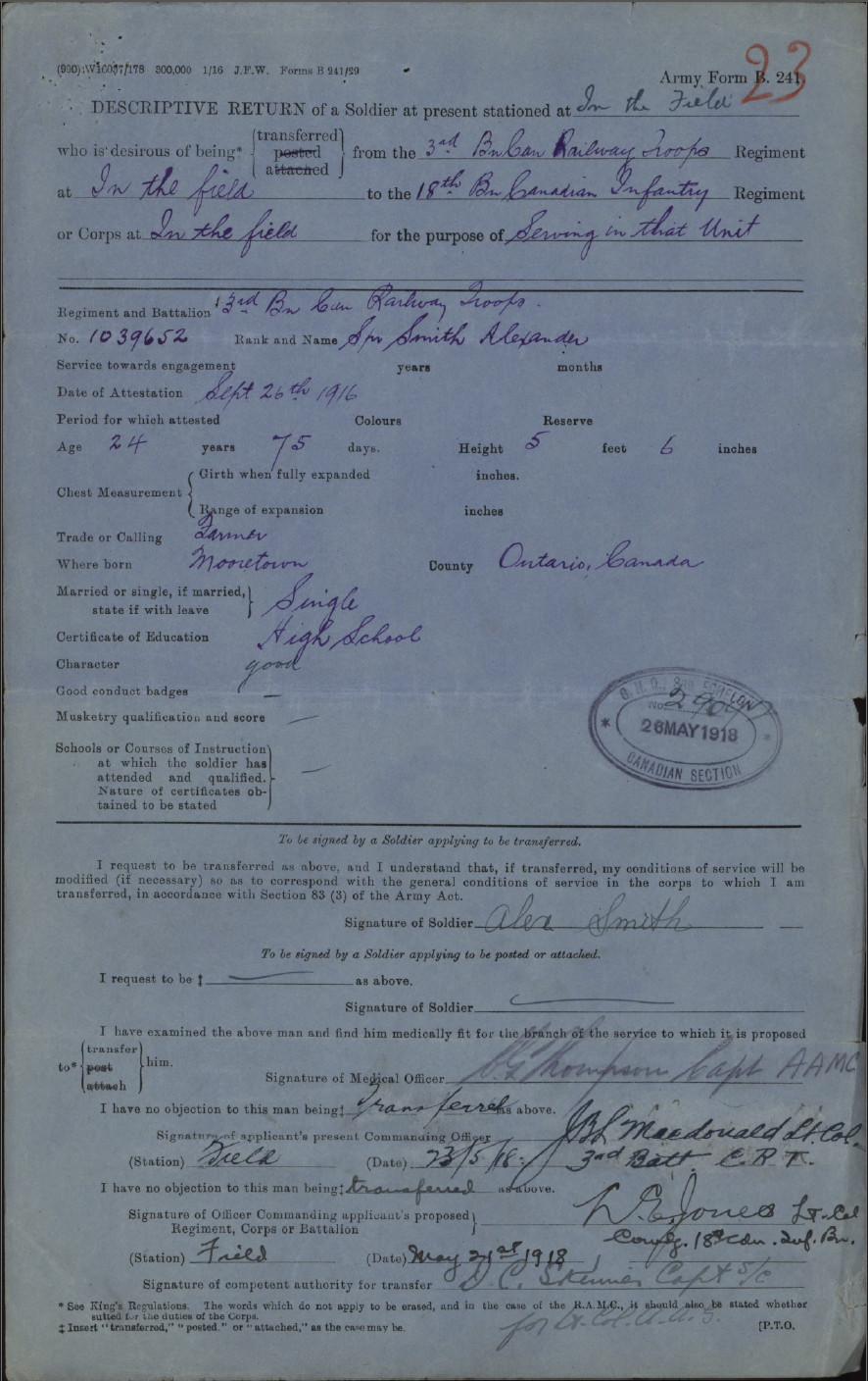 His regimental number is 1039652. He enlisted with the 239th Battalion (Railway Construction Corps) on 28 September 1916. He went overseas and served with other units until being transferred to the 18th Battalion, arriving “in the field” on 31 August 1918. He served the rest to the war with the 18th and was discharged due to demobilization on 24 May 1919 at London, Ontario.