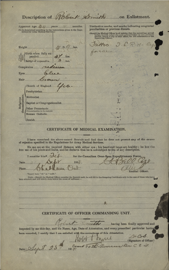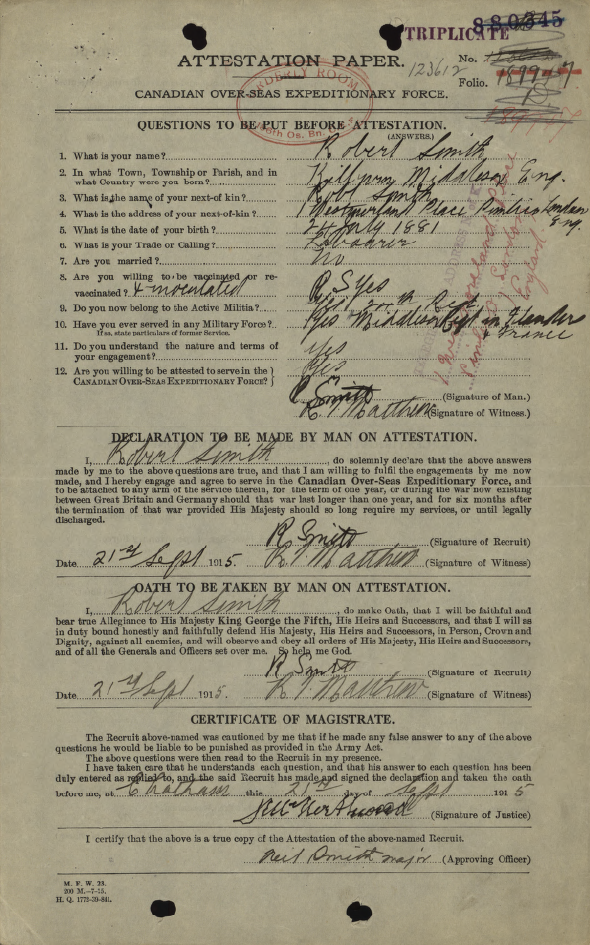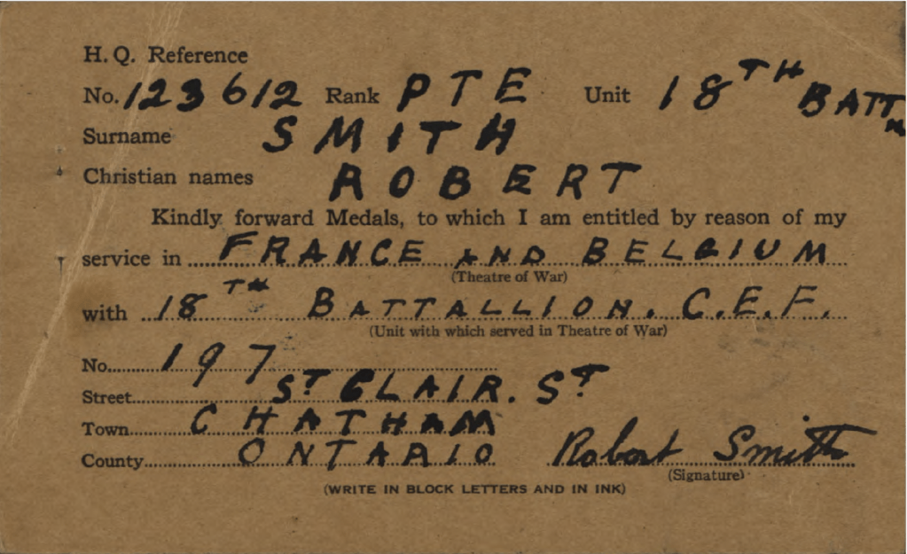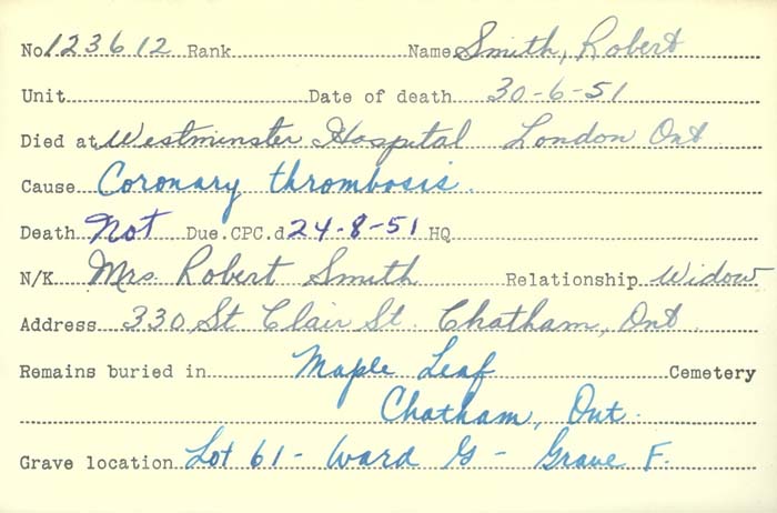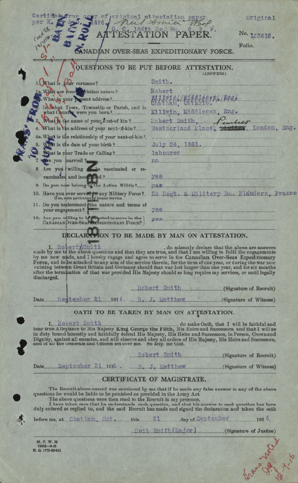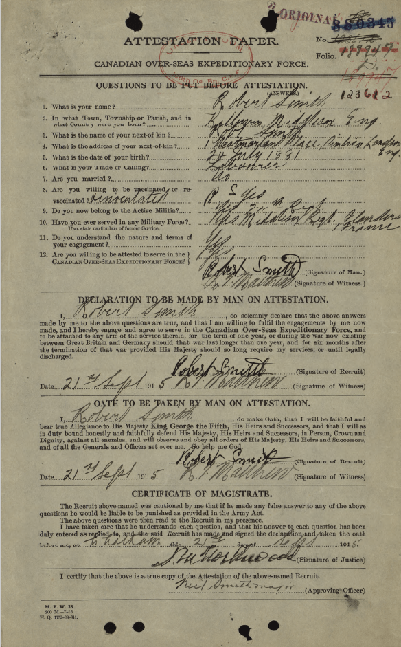 Family Search: Private Robert Smith was born on 24 July 1881, in Kilburn, Middlesex, England, United Kingdom as the son of Robert Smith. He immigrated to Canada in 1913 and lived in Chatham, Kent, Ontario, Canada for about 6 years. He registered for military service in 1916. In 1916, at the age of 35, his occupation is listed as labourer in Chatham, Kent, Ontario, Canada. He died on 30 June 1951, in London, Ontario, Canada, at the age of 69, and was buried in Maple Leaf Cemetery, Chatham, Chatham-Kent, Ontario, Canada.
