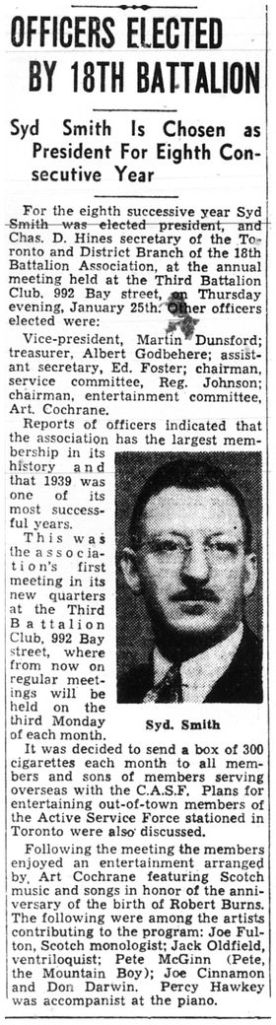 For the eighth successive year, Syd Smith was elected president, and Chas. D. Hines secretary of the Toronto and District Branch of the 18th Battalion Association, at the annual meeting held at the Third Battalion Club, 992 Bay Street, on Thursday evening, January 25th. Other officers elected were: