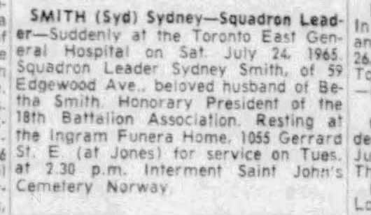 Family Search: When Private Sydney Smith was born on 31 October 1895, in Leeds, West Yorkshire, England, United Kingdom, his father, Walter Smith, was 31 and his mother, Ann Elizabeth Hall, was 24. He married Bertha Mildred French on 29 April 1926, in Toronto, Ontario, Canada. They were the parents of at least 1 son. He registered for military service in 1915. In 1915, at the age of 20, his occupation is listed as box maker. He died on 24 July 1965, in East York, Toronto, Ontario, Canada, at the age of 69, and was buried in St John’s Norway Cemetery, Toronto, Ontario, Canada.