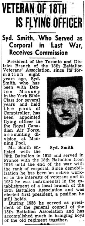 For the eighth successive year, Syd Smith was elected president, and Chas. D. Hines secretary of the Toronto and District Branch of the 18th Battalion Association, at the annual meeting held at the Third Battalion Club, 992 Bay Street, on Thursday evening, January 25th. Other officers elected were: