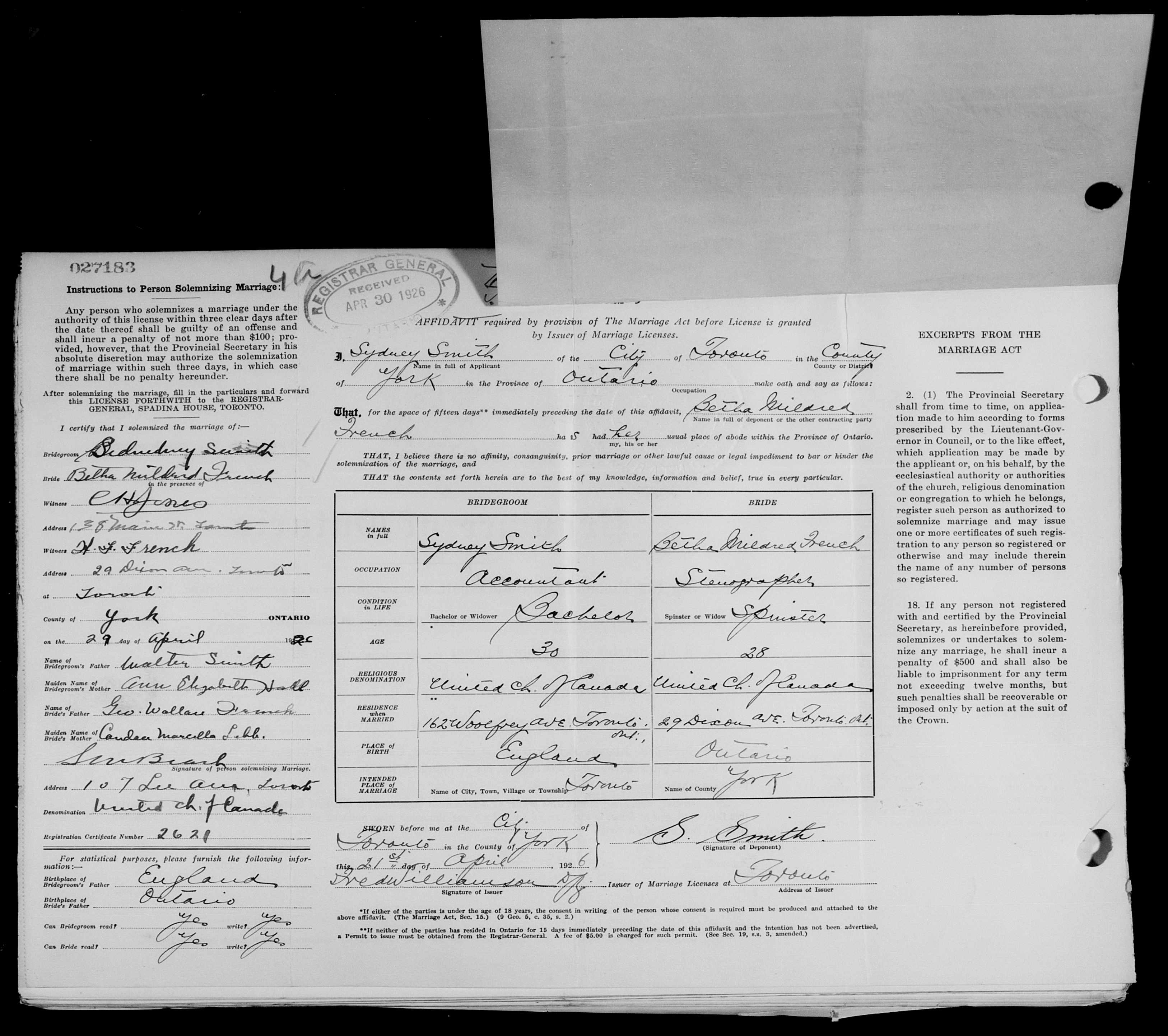 Family Search: When Private Sydney Smith was born on 31 October 1895, in Leeds, West Yorkshire, England, United Kingdom, his father, Walter Smith, was 31 and his mother, Ann Elizabeth Hall, was 24. He married Bertha Mildred French on 29 April 1926, in Toronto, Ontario, Canada. They were the parents of at least 1 son. He registered for military service in 1915. In 1915, at the age of 20, his occupation is listed as box maker. He died on 24 July 1965, in East York, Toronto, Ontario, Canada, at the age of 69, and was buried in St John’s Norway Cemetery, Toronto, Ontario, Canada.