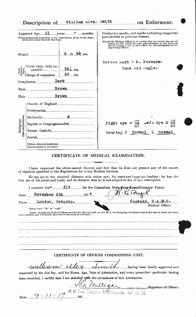 Family Search: When Private Alexander William Smith was born on 3 October 1896, in Alcona, Haynes Township, Alcona, Michigan, United States, his father, Theodore Martin Smith, was 27 and his mother, Phoebe Matilda Slater, was 25. He married Florence Lacount on 30 May 1916, in Midland, Midland, Michigan, United States. He lived in Knife River, Lake, Minnesota, United States in 1910. He registered for military service in 1917. In 1917, at the age of 21, his occupation is listed as machinist in Freeland, Township of Tittabawassee, Saginaw, Michigan, United States. He died on 12 March 1922, in Saginaw, Saginaw, Michigan, United States, at the age of 25, and was buried in Oakwood Cemetery, Saginaw, Michigan, United States