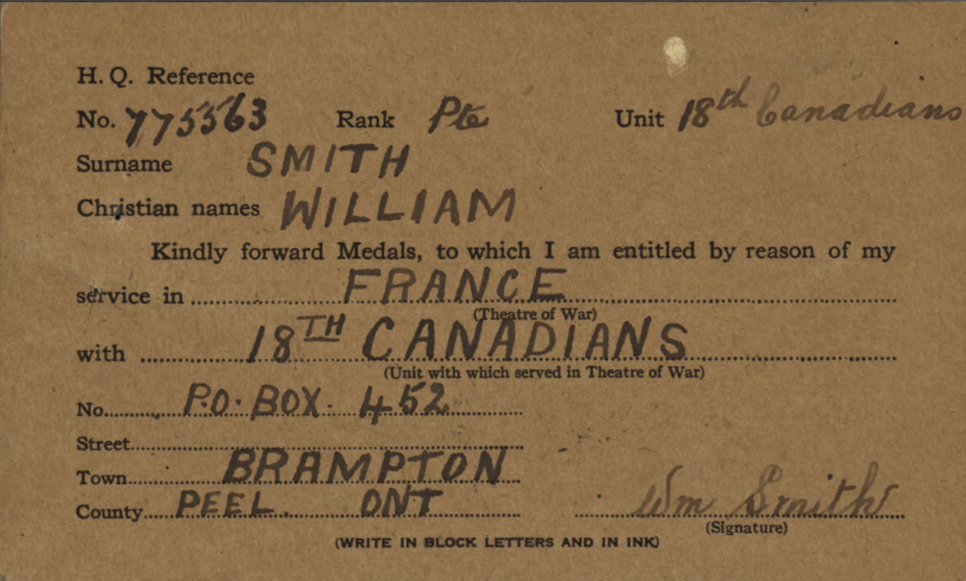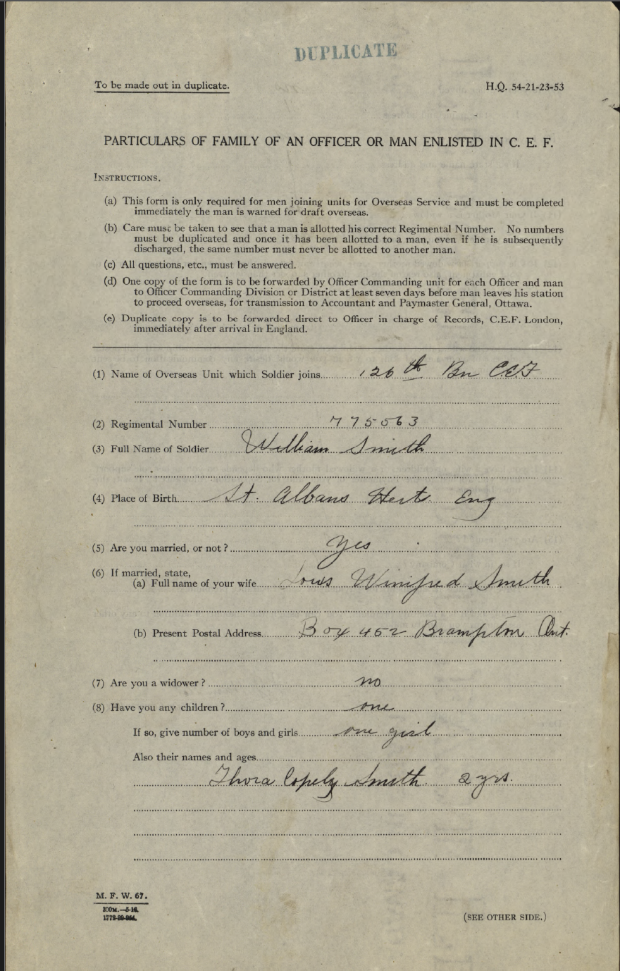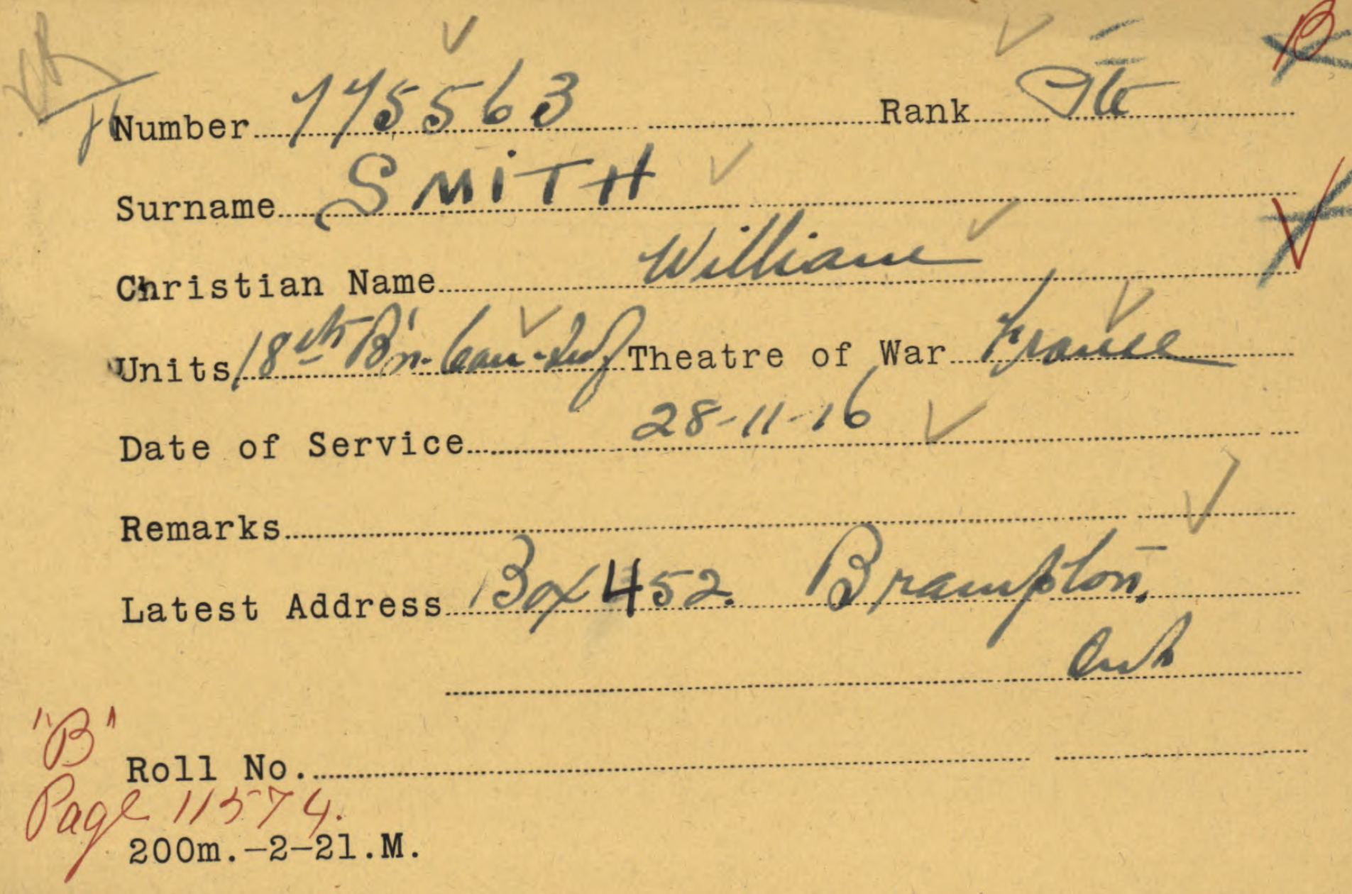 Family Search: When Private William Smith was born on 23 September 1889, in St Albans, Hertfordshire, England, United Kingdom, his father, Ebenezer Smith, was 44 and his mother, Ellen Copley, was 42. He married Louie Winifred Muncey on 3 April 1913. They were the parents of at least 2 daughters. He lived in St Peter, Hertfordshire, England, United Kingdom in 1891 and Brampton, Peel, Ontario, Canada in 1921. He registered for military service in 1915. In 1915, at the age of 26, his occupation is listed as florist in Brampton, Peel, Ontario, Canada. He died on 7 May 1954, in Horsham, Sussex, England, United Kingdom, at the age of 64, and was buried in Horsham, Sussex, England, United Kingdom.