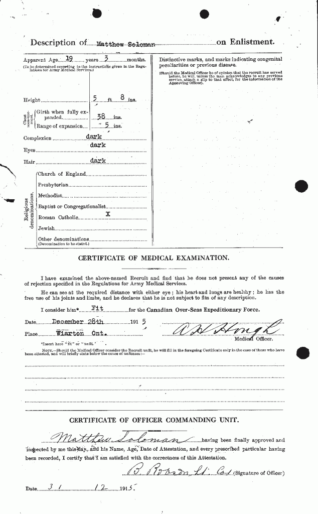 He was the son of Alexander and Elizabeth Solomon of Chippawa Hill, Ontario, the husband of Laura Solomon, and the father of nine children ranging in age from 2 to 19.