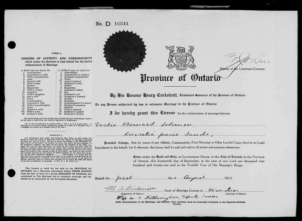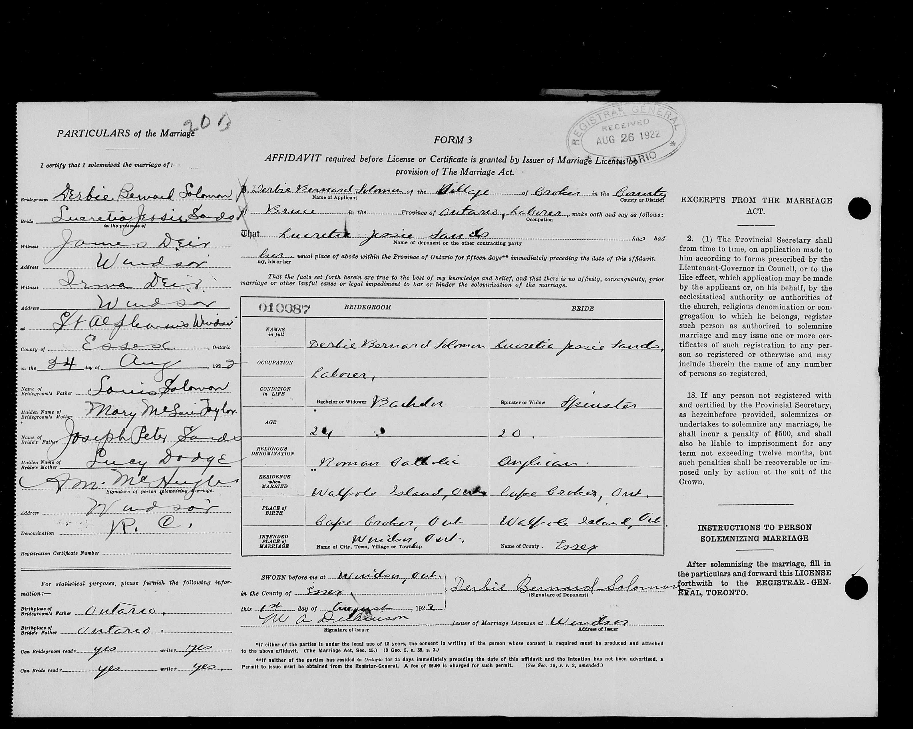 Family Search: Private Derbie Bernard Solomon was born on 27 August 1898, in Cape Croker, Neyaashiinigmiing, Bruce, Ontario, Canada as the son of Louis Solomon and Marie Marcelina Taylor. He married Lucretia Jessie Sands on 1 August 1922, in Windsor, Sandwich, Essex, Ontario, Canada. They were the parents of at least 2 sons and 1 daughter. He lived in Wiarton, Bruce, Ontario, Canada in 1962. He registered for military service in 1962. In 1915, at the age of 17, his occupation is listed as fisherman. He died on 2 February 1962, in Wiarton, Bruce, Canada West, British North America, at the age of 63.