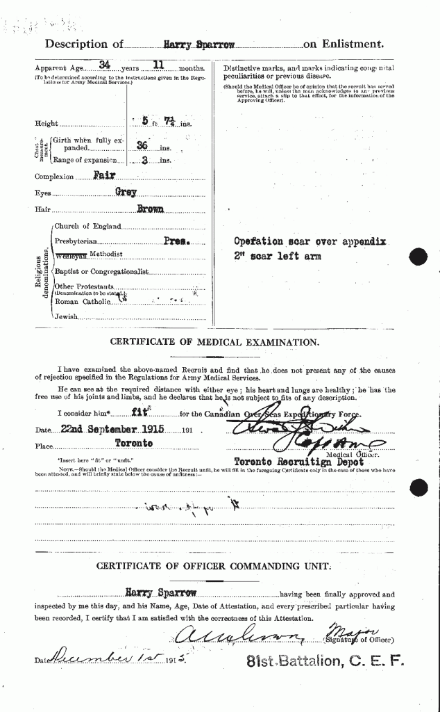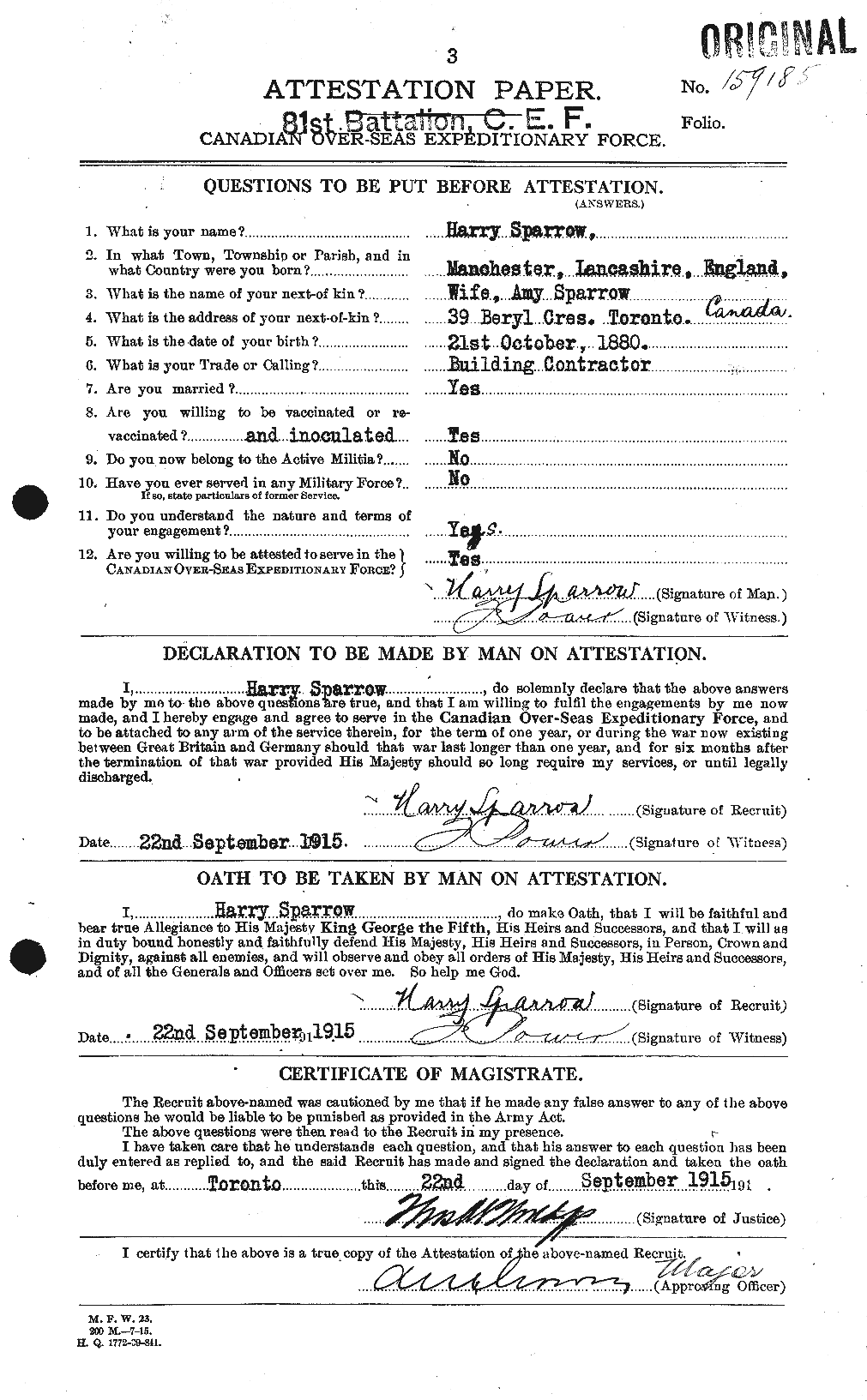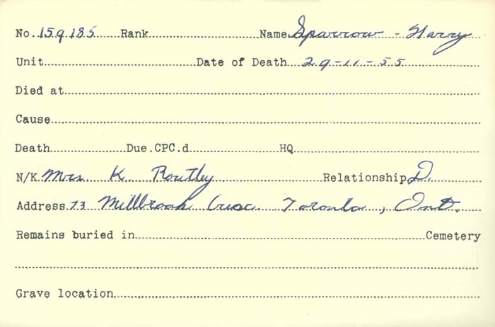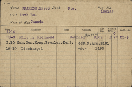 Sparrow, Harry: Service no. 159185 Digitized Service Record Source: Per news clipping post by David Archer at 18th Battalion Facebook Page (not group). Find-A-Grave Sparrow, Harry: Service no. 159185. Toronto Telegram. September 1916. Via David Archer. Sparrow, Harry: Service no. 159185. Toronto Telegram. September 1916. Via David Archer. Share this: Click to email a link to a friend (Opens in new window) Email Click to share on Facebook (Opens in new window) Facebook Click to share on X (Opens in new window) X Click to share on Reddit (Opens in new window) Reddit Click to share on LinkedIn (Opens in new window) LinkedIn Click to print (Opens in new window) Print Click to share on Tumblr (Opens in new window) Tumblr Click to share on Pocket (Opens in new window) Pocket Click to share on Pinterest (Opens in new window) Pinterest Click to share on Telegram (Opens in new window) Telegram Click to share on WhatsApp (Opens in new window) WhatsApp Like Loading...