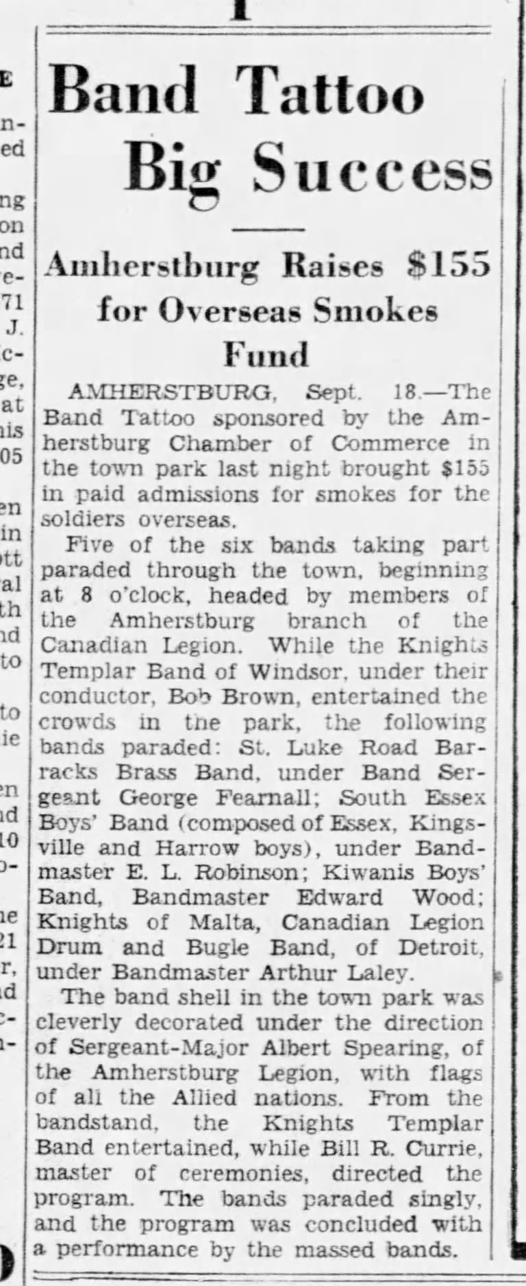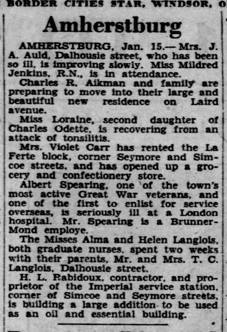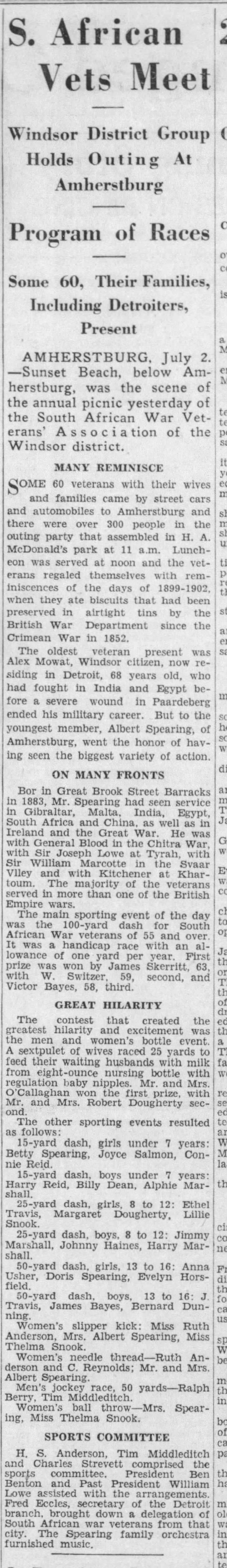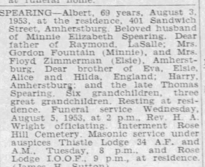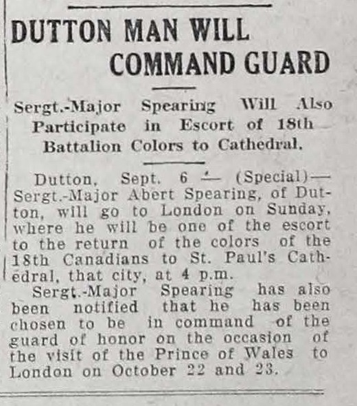 Family Search: When Company Sergeant Major Albert Spearing was born on 15 September 1883, in Aston, Warwickshire, England, United Kingdom, his father, Thomas Orlando Spearing, was 28 and his mother, Sarah Pratley, was 27. He had at least 1 daughter with Minnie Elizabeth Howard. He immigrated to Canada in 1908 and lived in Elgin, Ontario, Canada in 1911 and Dutton, Elgin, Ontario, Canada in 1914. He registered for military service in 1914. In 1914, at the age of 31, his occupation is listed as labourer in Dutton, Elgin, Ontario, Canada. He died on 3 August 1953, in Amherstburg, Essex, Ontario, Canada, at the age of 69, and was buried in Rose Hill Cemetery, Amherstburg, Essex, Ontario, Canada.