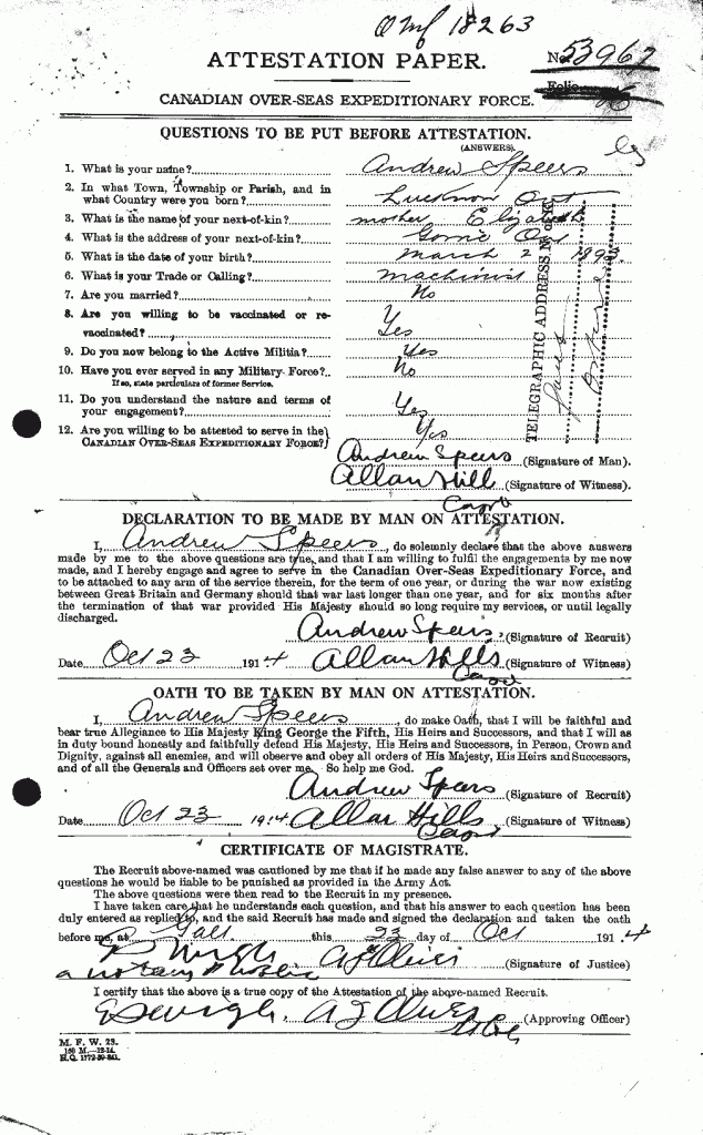Family Search: When James Andrew Wilson Speers was born on 2 March 1893, in Ashfield, Huron, Ontario, Canada, his father, William Speers, was 44 and his mother, Elizabeth Black, was 27. He married Nellie Cushing on 25 September 1922, in Ontario, Ontario, Canada. He lived in Ontario, Canada in 1911 and Kitchener, Waterloo, Ontario, Canada in 1921. He registered for military service in 1914. In 1914, at the age of 21, his occupation is listed as machinist. He died on 30 April 1939, in London, Ontario, Canada, at the age of 46, and was buried in Woodland Cemetery, Kitchener, Waterloo, Ontario, Canada.