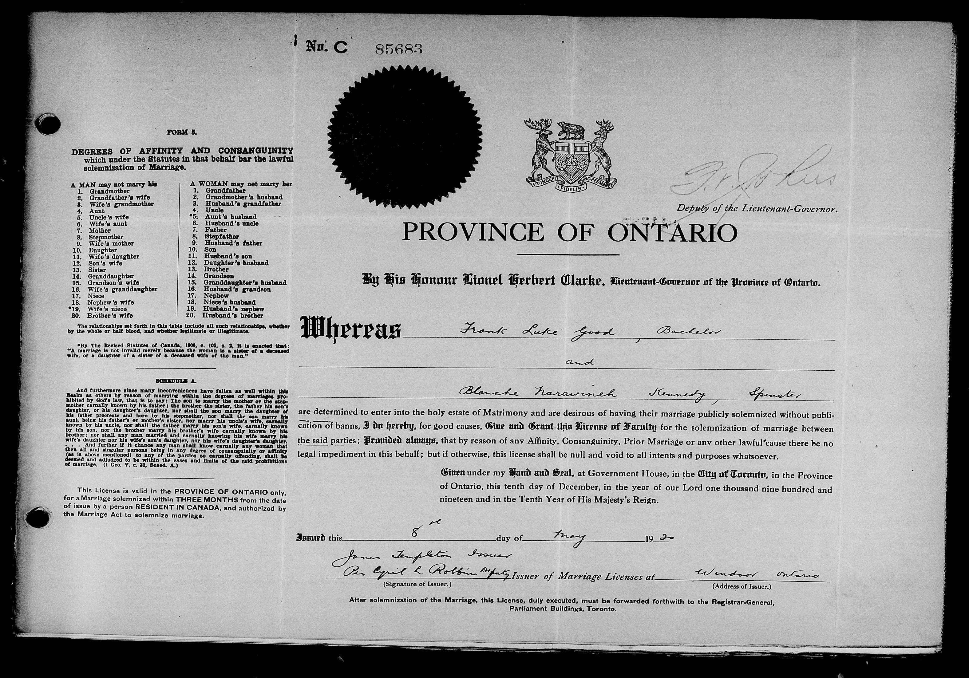 Family Search: When James Andrew Wilson Speers was born on 2 March 1893, in Ashfield, Huron, Ontario, Canada, his father, William Speers, was 44 and his mother, Elizabeth Black, was 27. He married Nellie Cushing on 25 September 1922, in Ontario, Ontario, Canada. He lived in Ontario, Canada in 1911 and Kitchener, Waterloo, Ontario, Canada in 1921. He registered for military service in 1914. In 1914, at the age of 21, his occupation is listed as machinist. He died on 30 April 1939, in London, Ontario, Canada, at the age of 46, and was buried in Woodland Cemetery, Kitchener, Waterloo, Ontario, Canada.