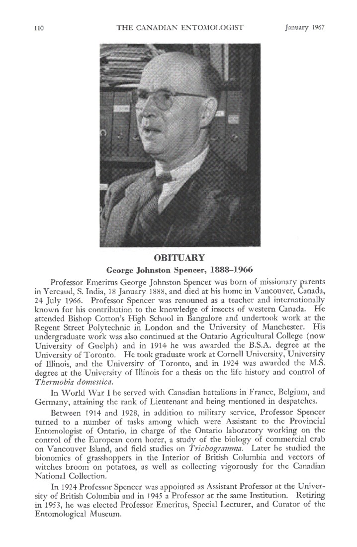 George Johnston Spencer, 1888-1966Professor Emeritus George Johnston Spencer was born of missionary parents in Yercaud, S. India, 18 January 1888, and died at his home in Vancouver, Canada, 24 July 1966. Professor Spencer was renowned as a teacher and internationally known for his contribution of insects of western Canada. He attended Bishop Cotton’s High School in Bangalore and undertook work at the Regent Street Polytechnic in London and the University of Manchester. His undergraduate work was also continued at the Ontario Agricultural College (now University of Guelph) and in 1914 was awarded the B.S.A. degree at the University of Toronto. He took graduate work at Cornell University, University of Illinois, and the University of Toronto, and in 1924 was awarded the M.S. degree at the University of Illinois for a thesis on the life history and control of Thermobia demestica.