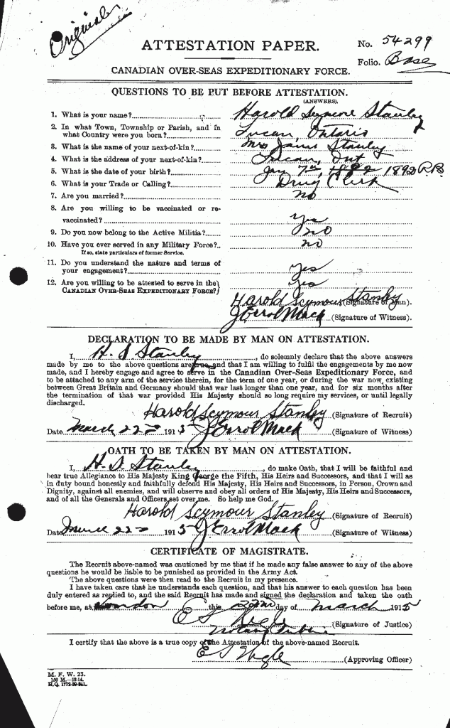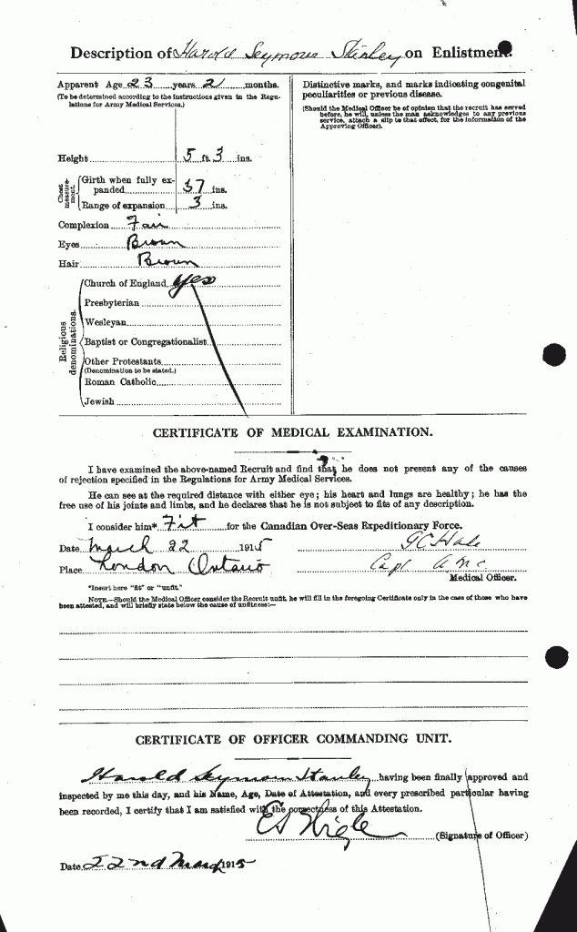 Pte. Harold Stanley of the 18th Battalion and son of Mr. and Mrs. Jas. Stenley, Lucan, is suffering fron a gunshot wound in the had and left arm and in the hospital overseas.