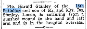 Pte. Harold Stanley of the 18th Battalion and son of Mr. and Mrs. Jas. Stenley, Lucan, is suffering fron a gunshot wound in the had and left arm and in the hospital overseas.