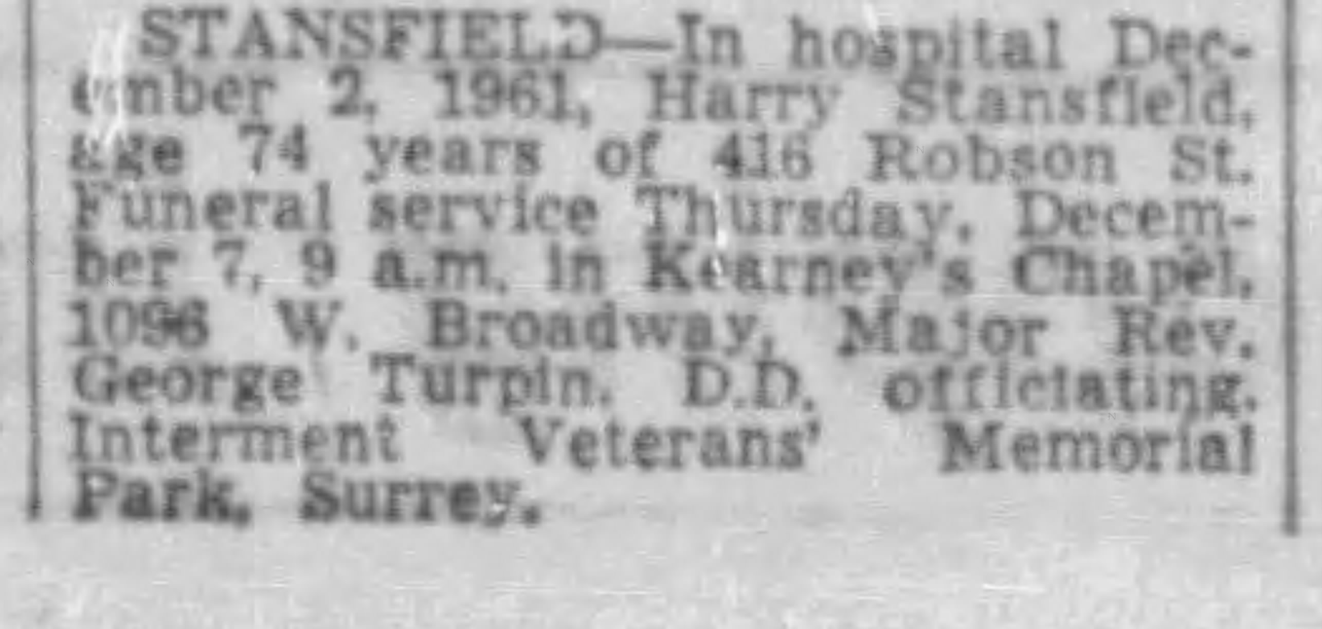 Family Search: When Private Harry Stansfield was born on 8 October 1887, in Halifax, West Yorkshire, England, United Kingdom, his father, James Stansfield, was 42 and his mother, Mary Lumb, was 40. He married Dorothy Rachel Bartlett on 27 July 1923, in Toronto, Ontario, Canada. They were the parents of at least 1 son and 2 daughters. He immigrated to Canada in 1913 and lived in Sowerby Bridge, Yorkshire, England, United Kingdom in 1901 and Toronto, Ontario, Canada in 1922. He registered for military service in 1914. In 1914, at the age of 27, his occupation is listed as plasterer. He died on 2 December 1961, in Vancouver, British Columbia, Canada, at the age of 74, and was buried in Victory Memorial Park, Surrey, British Columbia, Canada.