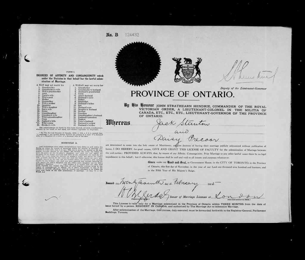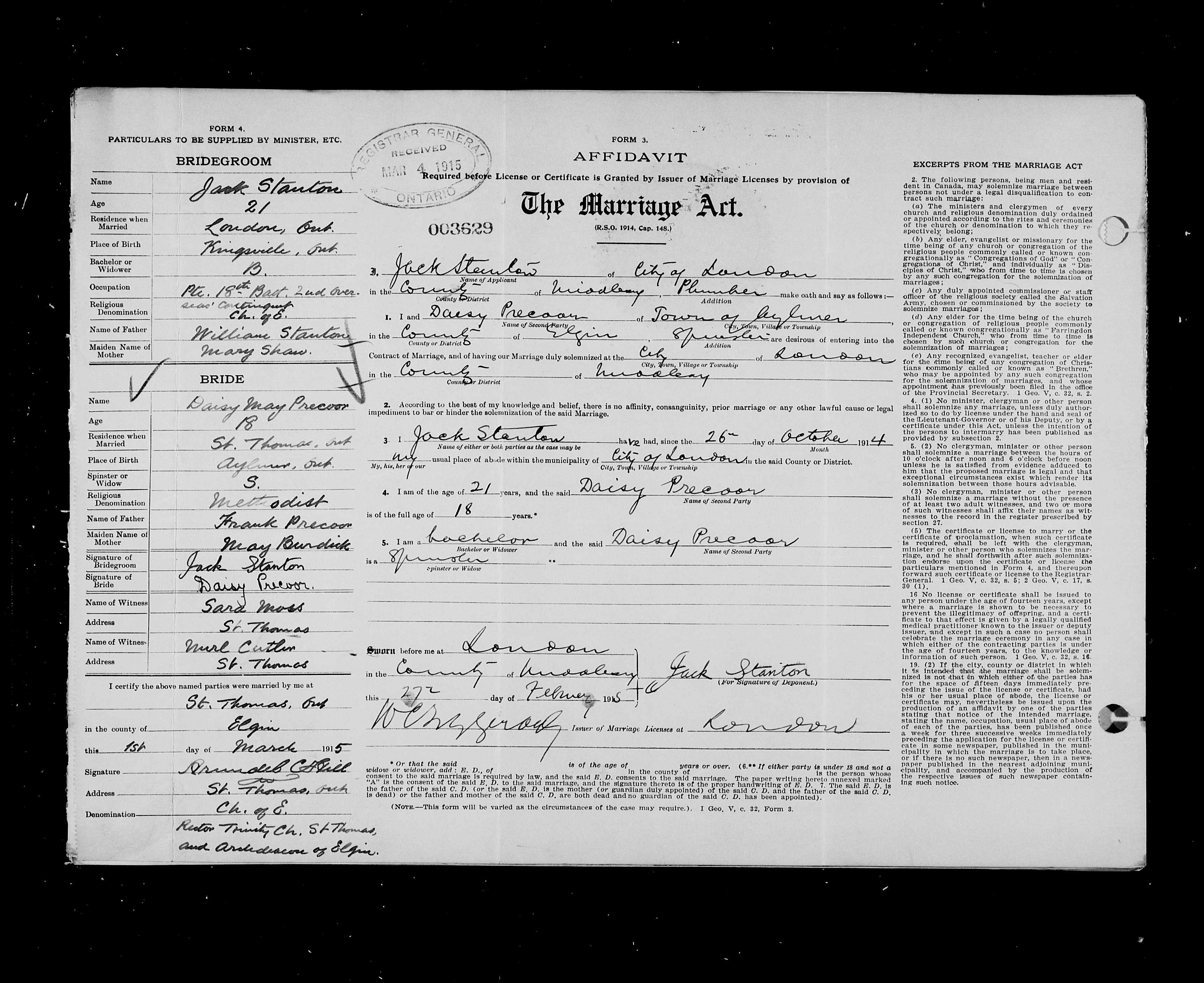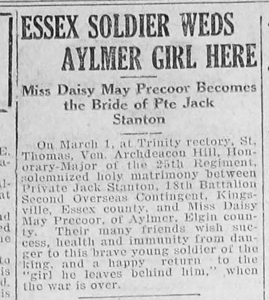 Family Search: When Corporal Jack Stanton was born on 4 April 1893, in Brighton, East Sussex, England, United Kingdom, his father, William Stanton, was 23 and his mother, Mary Shaw, was 23. He married Daisy May Precoor on 27 February 1915, in London, Ontario, Canada West, British Colonial America. They were the parents of at least 3 daughters. He registered for military service in 1914. In 1914, at the age of 21, his occupation is listed as pipe coverer. He died on 26 March 1947, in Aylmer, Elgin, Ontario, Canada, at the age of 53, and was buried in Aylmer Cemetery, Aylmer, Elgin, Ontario, Canada