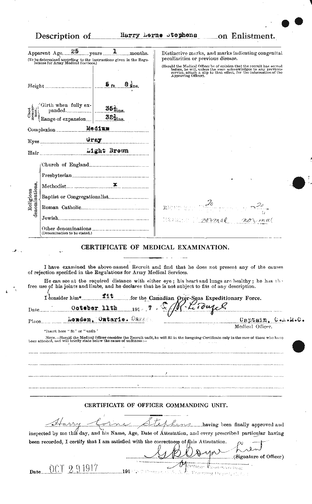 Below are the Attestation Papers for Stephens, Harry Lorne: Service no. 2591244.