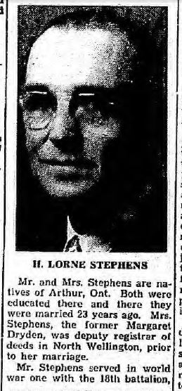 Family Search: When Harry Lorne Stephens was born on 4 September 1892, in Arthur, Wellington, Ontario, Canada, his father, Henry Stephens, was 37 and his mother, Elma Jane Spring, was 32. He married Margaret Dryden on 21 April 1928, in Wellington, Ontario, Canada. They were the parents of at least 1 son. He lived in Wellington, Ontario, Canada in 1901. He died on 23 July 1963, in Newmarket, York, Ontario, Canada, at the age of 70, and was buried in Greenfield Cemetery, Arthur, Arthur, Wellington, Ontario, Canada.