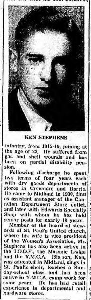 Member of the board of stewards of St. Paul’s United Church, where is wife is vice president of the Women’s Association, Mr. Stephens has been active in the I.O.O.F., the Masonic Lodge and the Y.M.C.A His son, Ken, was educated in Midland, sings in St. Paul’s choir, teaches a Sunday-school class and have been active in the Y.M.C.A. camp work for some years. He has retail experience in departmental and hardware stores.