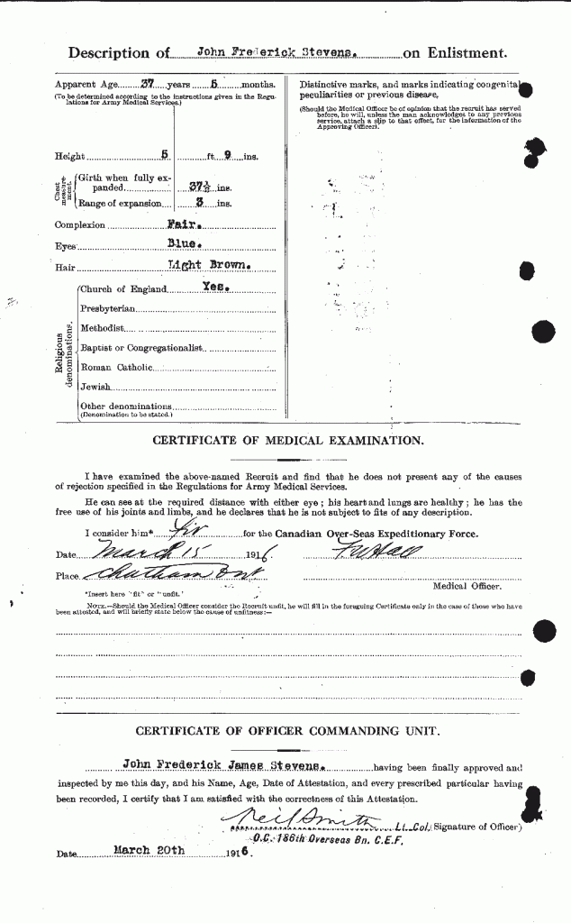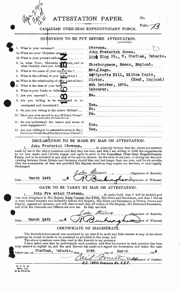 Stevens, John Frederick James: Service no. 880516 Digitized Service Record Source: Per post by Allan Miller at 18th Battalion Facebook Group. Find-A-Grave Gathering Our Heroes Source: Chatham Daily News. March 19, 1917. Via Allan Miller 18th Battalion Facebook Group. Share this: Click to email a link to a friend (Opens in new window) Email Click to share on Facebook (Opens in new window) Facebook Click to share on X (Opens in new window) X Click to share on Reddit (Opens in new window) Reddit Click to share on LinkedIn (Opens in new window) LinkedIn Click to print (Opens in new window) Print Click to share on Tumblr (Opens in new window) Tumblr Click to share on Pocket (Opens in new window) Pocket Click to share on Pinterest (Opens in new window) Pinterest Click to share on Telegram (Opens in new window) Telegram Click to share on WhatsApp (Opens in new window) WhatsApp Like Loading...