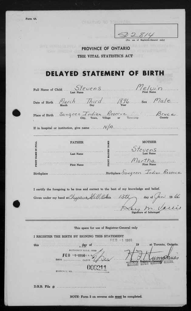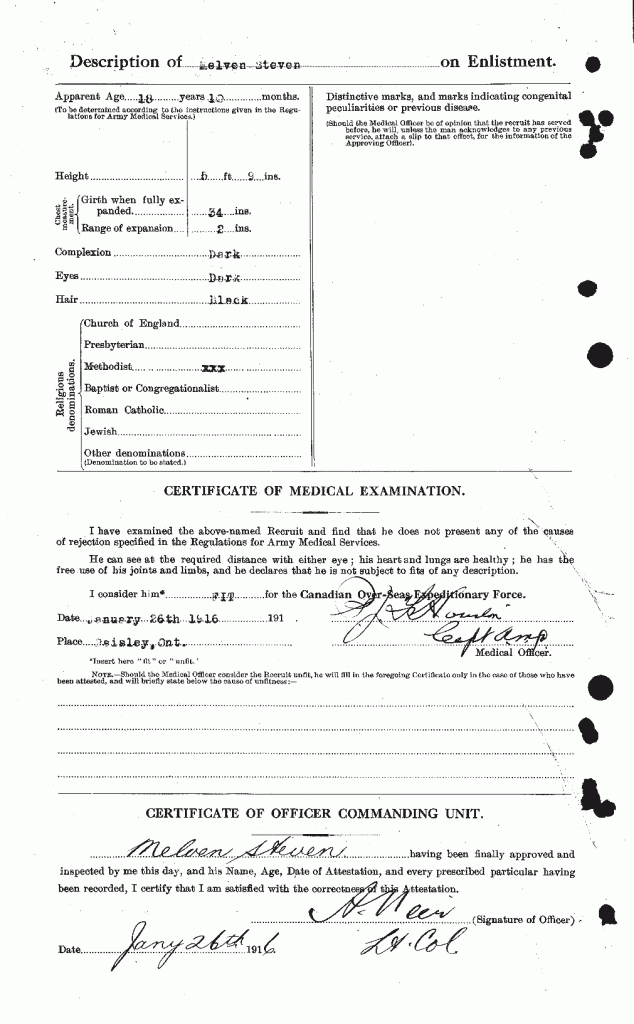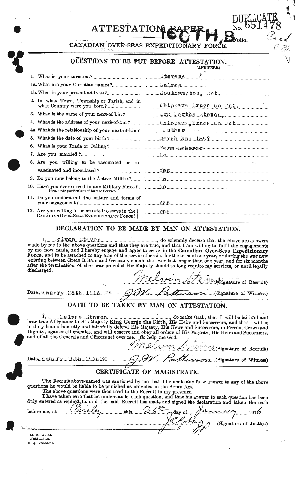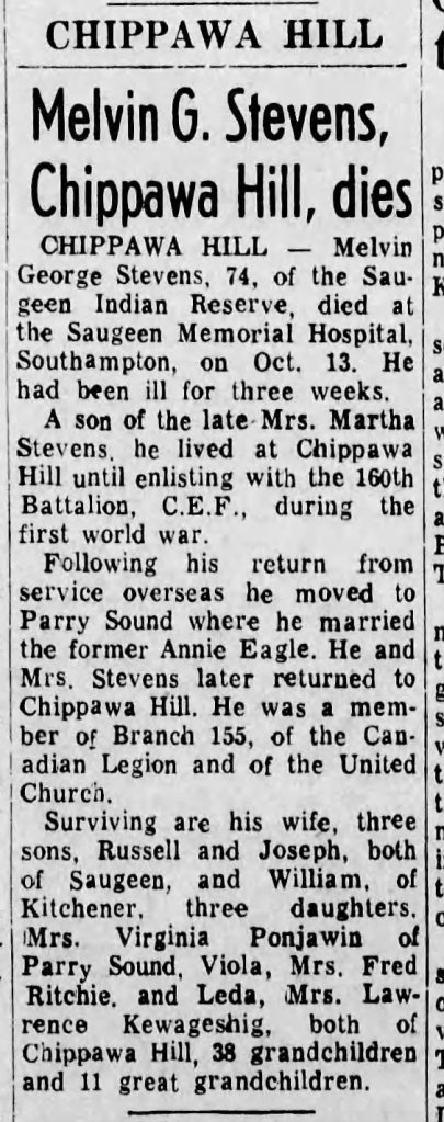 Family Search: Private Melvin G. Stevens was born on 2 March 1896, in Chippawa Hill, Saugeen 29, Bruce, Ontario, Canada as the son of ? and Martha Stevens. He had at least 3 sons and 3 daughters with Annie Eagle. He lived in Caledonia, Haldimand, Ontario, Canada in 1922. He registered for military service in 1916. In 1916, at the age of 20, his occupation is listed as farm labourer. He died on 13 October 1969, in Southampton, Saugeen Shores, Bruce, Ontario, Canada, at the age of 73, and was buried in Chippawa Hill Saugeen Reserve Cemetery, Chippawa Hill, Saugeen 29, Bruce, Ontario, Canada.